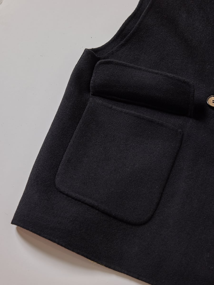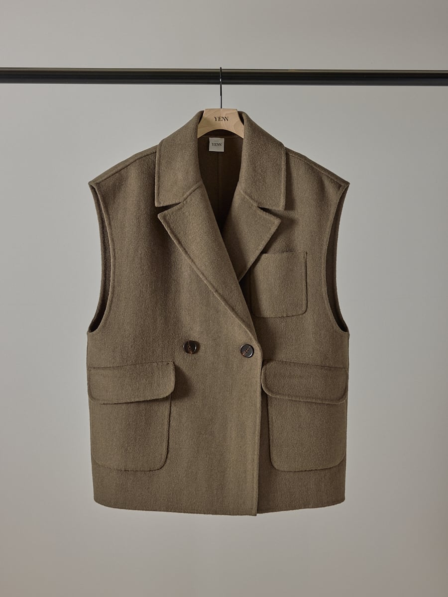リバー仕立てのベスト型ジャケットです。 リバー仕立てとは、2枚の生地を貼り合わせ、手作業でまつり縫いをすることで、縫い目が見えない洗練されたデザインになる仕立てで、軽くて柔らかい着心地が特徴です。 リラックスフィットのオーバーサイズシルエットで、ニットやジャケット、コートの上にもプラスできるアイテムです。 ミリタリーベストをデザインソールとしたポケットデザインがポイントで、エレガンスになりがちなリバーベストにカジュアル感をプラスしました。スタイリングにトレンド感をプラスしてくれる1枚です。