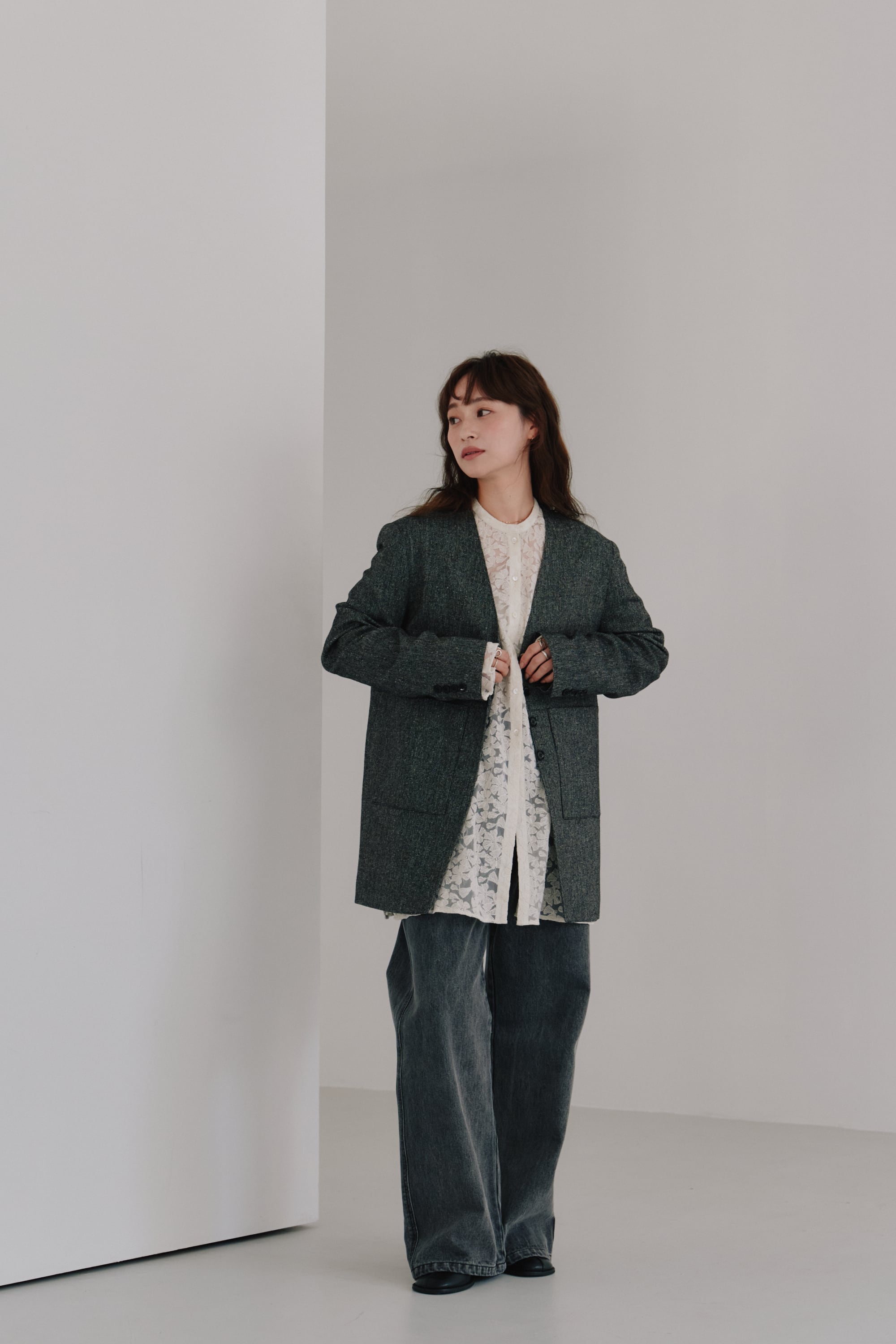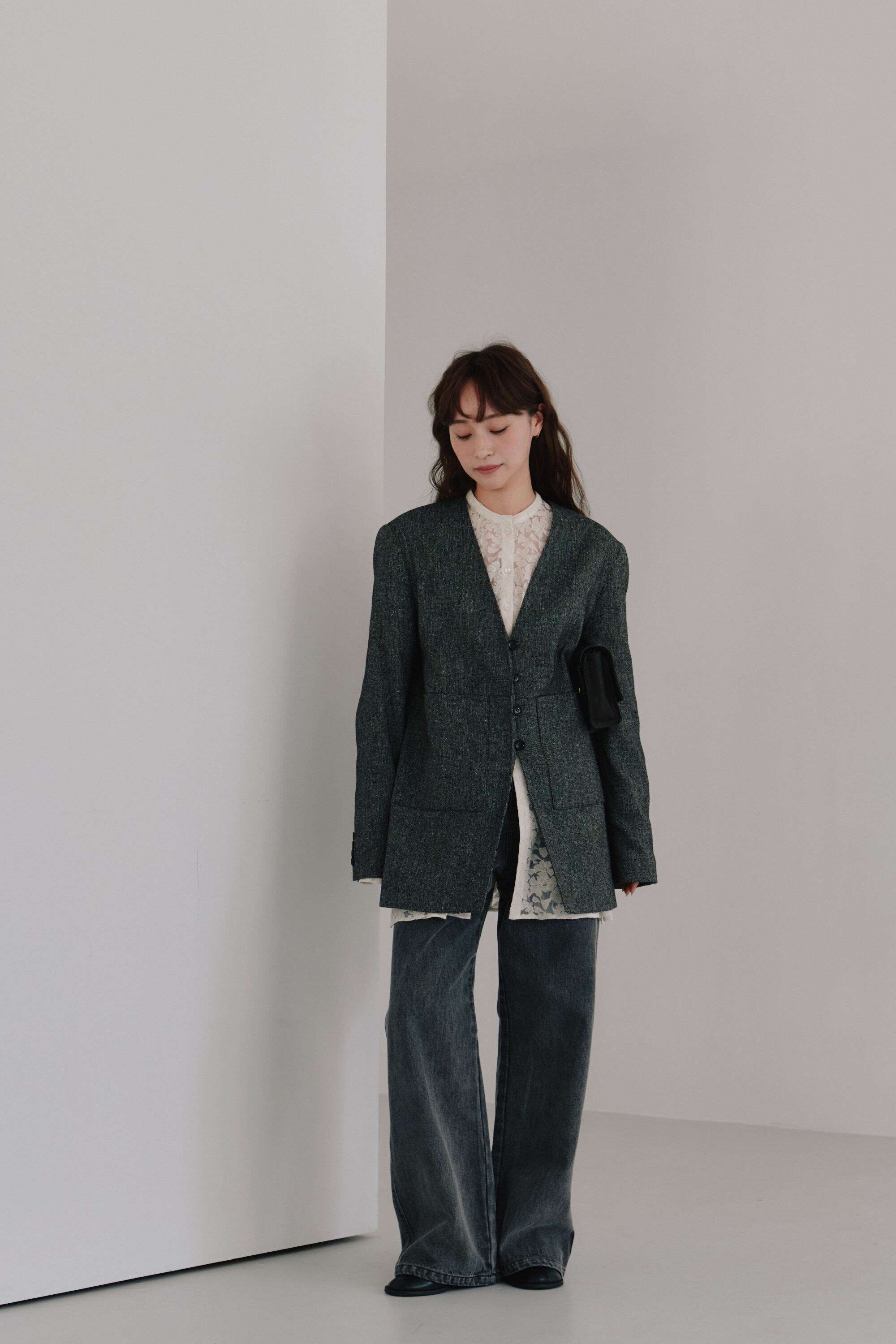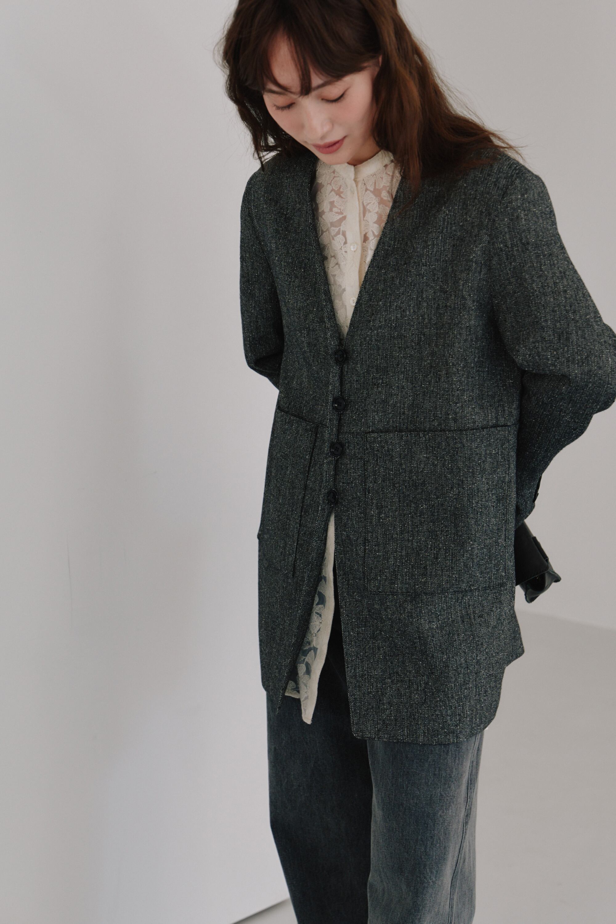 リサイクルウールを使用したツイード素材にシルクならではの上品な輝きを加えることで、重たくならず、軽やかで洗練された印象を叶えます。