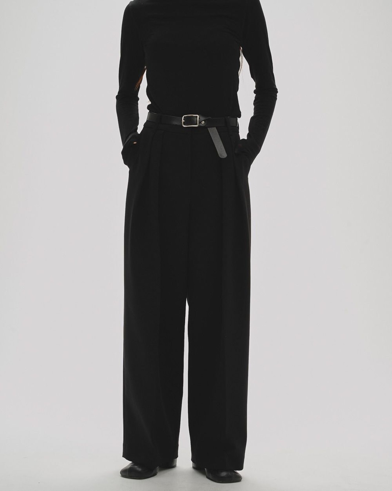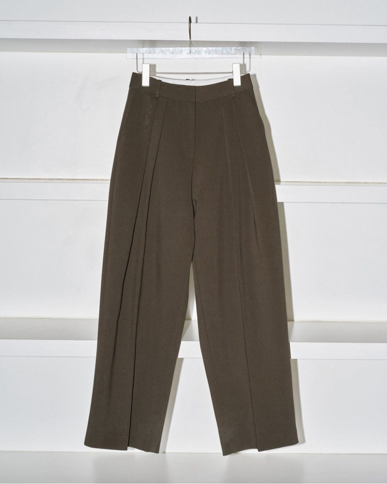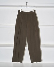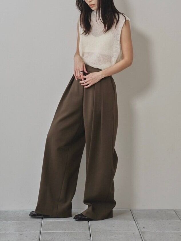 深めのダブルタックとワイドなシルエットが魅力のトラウザーズ。上質なツイル生地を使用し、内側に別生地をボンディング加工することで、シルエットをより立体的に見せてくれます。表地と同色のパイピングを挟んだオリジナルマーベルトとステッチを表に出さない仕立てがマニッシュでありながらも、どこか上品な印象に。