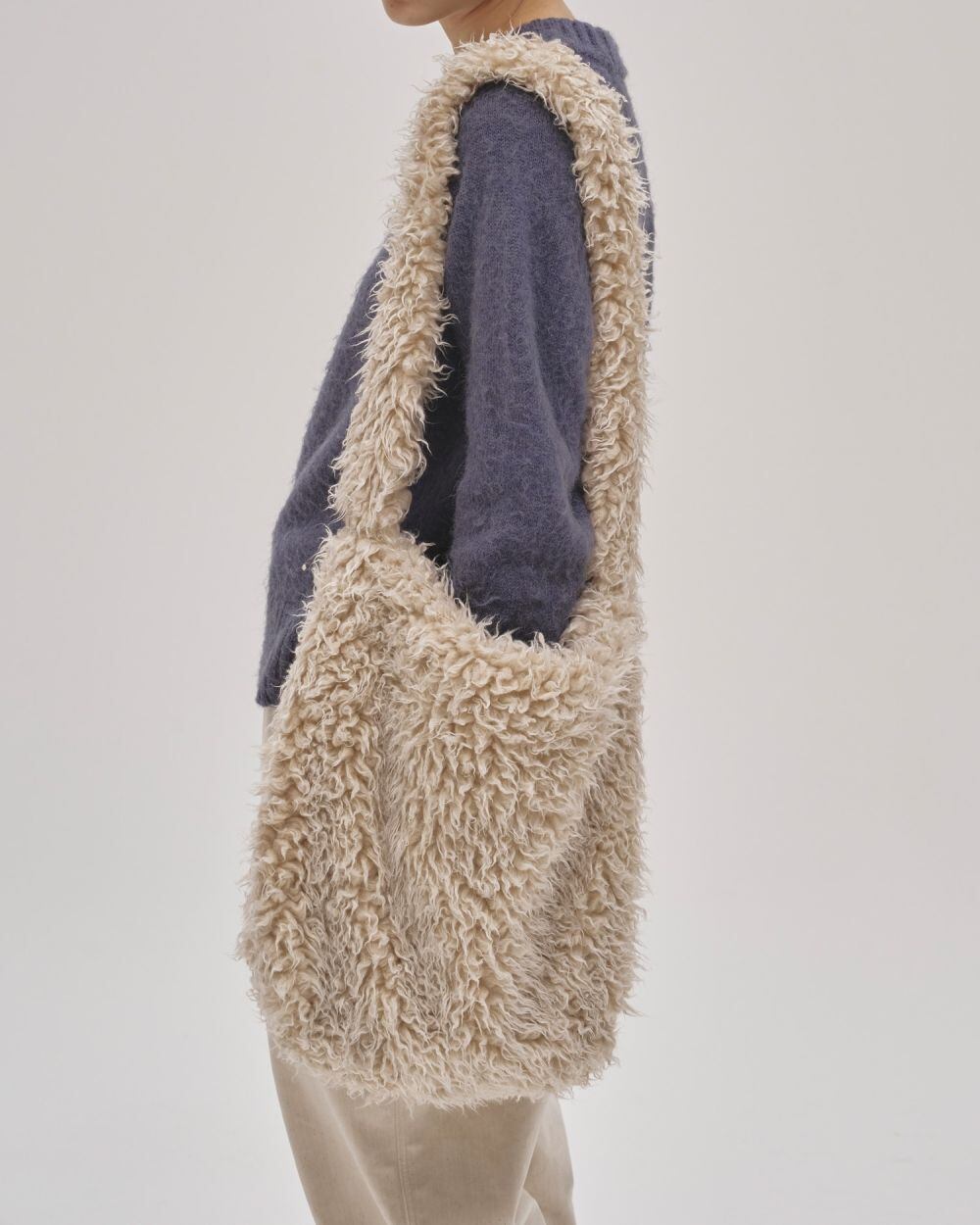柔らかな表情で毛足の長いファー素材を使用したショルダーバッグ。A4サイズが収まる程良い容量で、カジュアルなスタイルにさりげない季節感と奥行きをプラスしてくれます。コーディネートに自然と溶け込みながらも、程よい存在感を放つアイテムです。