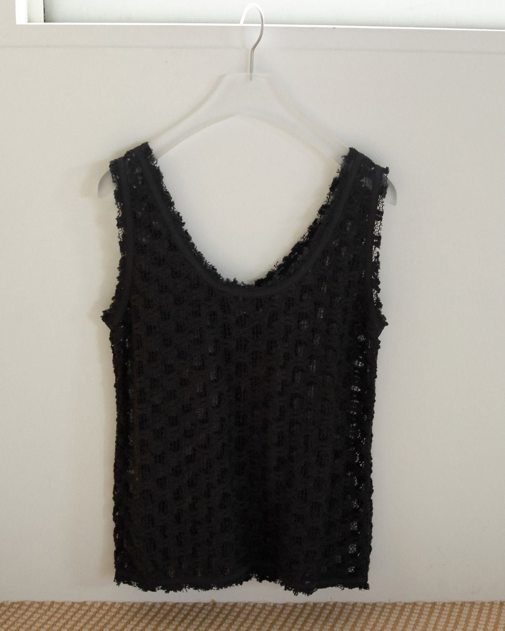 インド製のレース素材を使用したノースリーブブラウス。フロントはホックディテールでスッキリと仕上げました。 レースをカットオフした衿ぐりやアームホールのデザインもポイント。自然と腰回りから裾にかけて広がる位置にホックの止まりを設定しているので、着るだけでニュアンスあるスタイリングに決まります。前後2WAYで着用可能で、シンプルなレーストップスとしてジャケットのインナーとして着回したり、スタイリングに合わせてお楽しみいただけます。