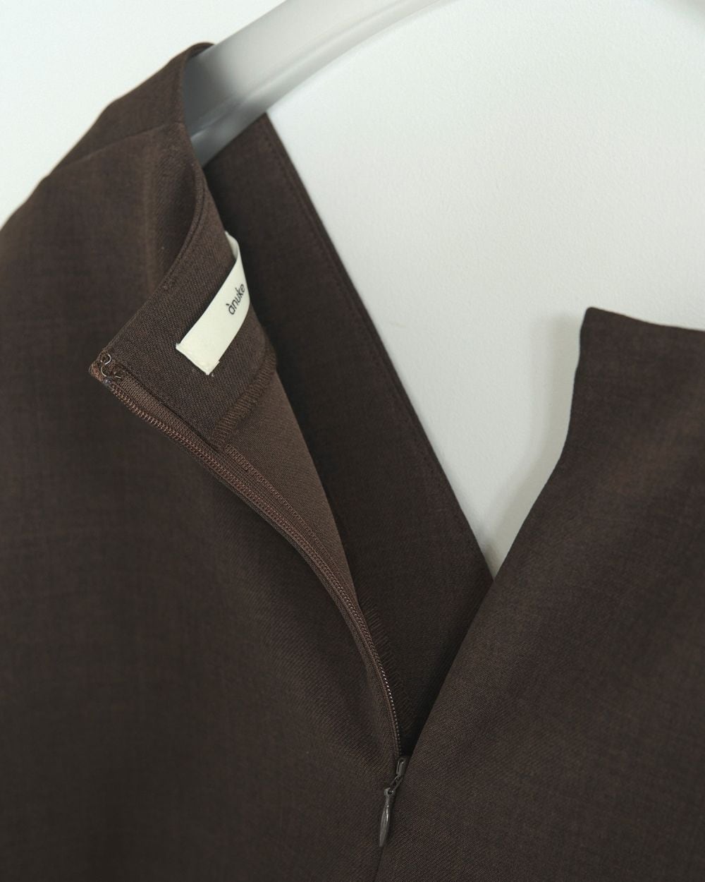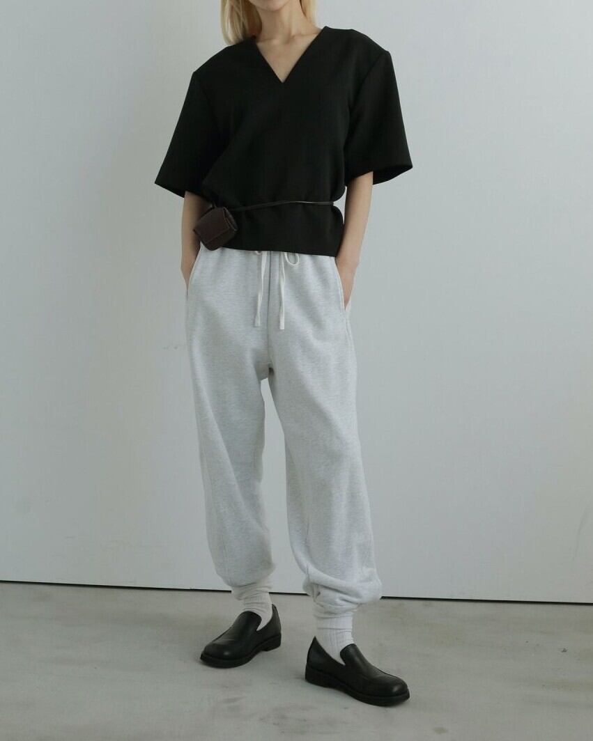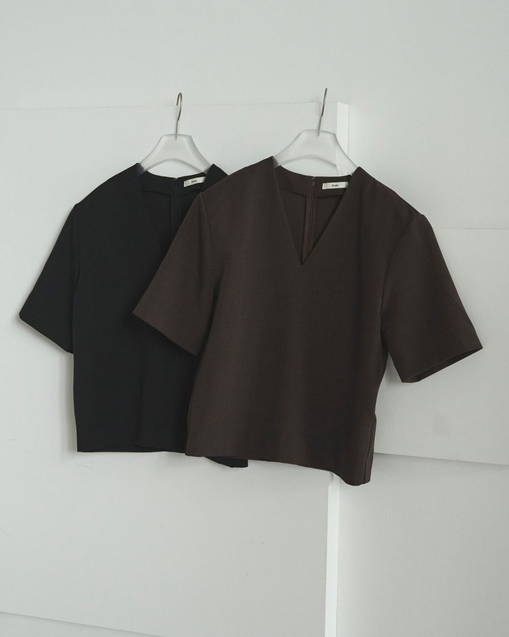 ダブルフェイスの綺麗目のツイル素材を使用し、モードに仕上げたVネックトップス。ドライタッチな表面に、裏面はフラットな肌触りの良い素材で、着心地の良さもポイント。肩パット付きで、フォルムを出したシルエットです。肩パットは着脱も可能です。腰回りは身体に程良く馴染むようスッキリとしたサイジングにしています。着用すると裾にが自然にたまり、動きが出ることで、こなれた着こなしに。深めのVネックが女性らしい一枚。あえてラフなボトムと合わせるのもおすすめです。