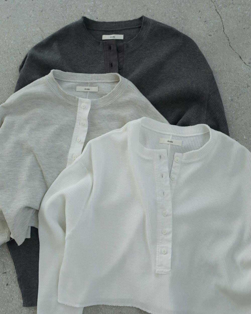 メンズのヘンリートップスをベースに、柔らかなワッフル素材とコンパクトなショート丈で女性らしく仕上げた一枚。別布使いフロントディテールや、飾りステッチを入れた、ニュアンスあるデザイン。 長めの袖にフィンガーホールつきです。綺麗目のワイドパンツやジャケットのインナーとして合わせる等、シックな着こなしがおすすめです。