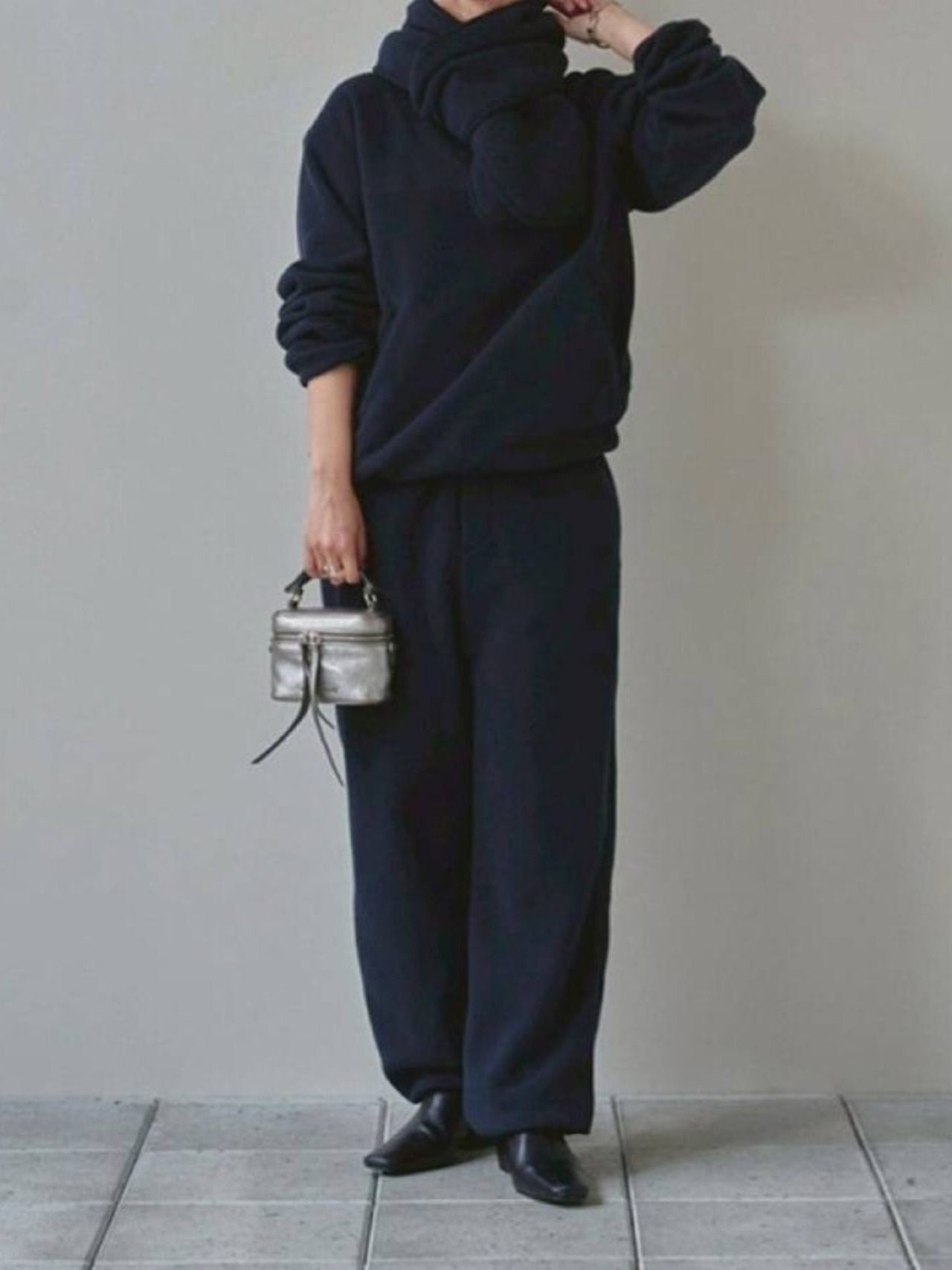 軽やかで柔らかなフリース生地を使用したプルオーバーとマフラーの2セット。パイピングやワンポイント刺繍、各パーツはボディと同色でまとめ、スタイリッシュな印象に仕上げました。アウターの中にもすっきり収まるシルエットで、冬のレイヤードスタイルや、同じ生地を使用したEasy Fleece Pantsとセットアップスタイルもおすすめです。