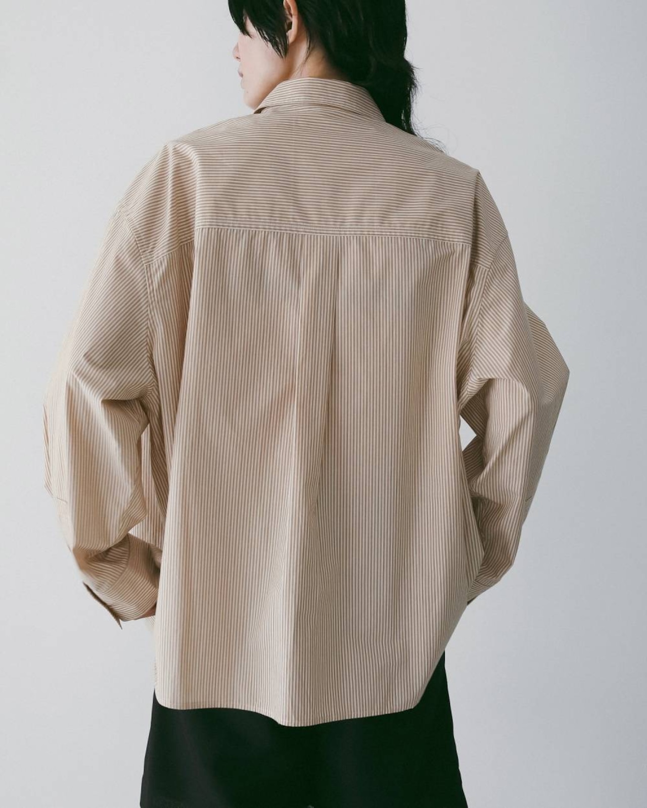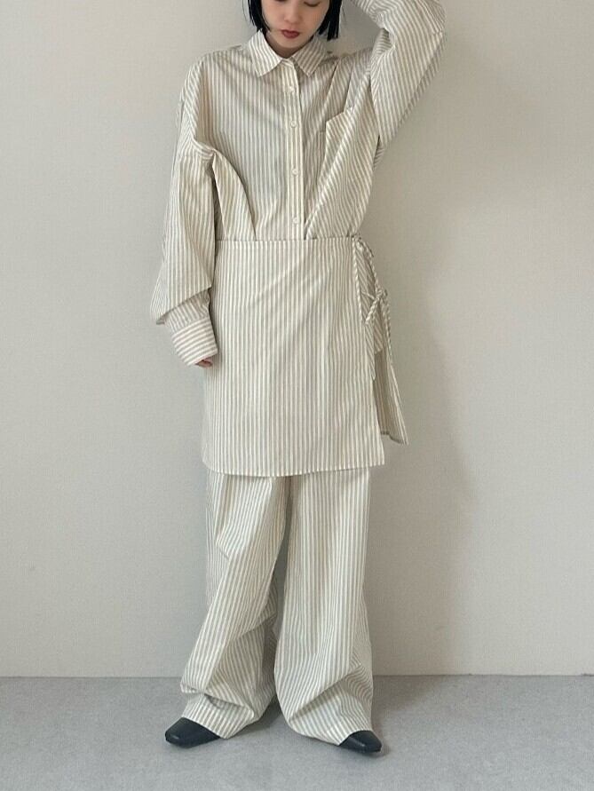 スタイリングのポイントになるストライプシャツ。オーバーなシルエットでラフに着ていただける一着。アイボリーはワントーン見えする3色の糸で織られたマルチストライプ。オレンジは2色のピンストライプに見えて、よく見ると細くもう1色ラインがあり、ほんのりと奥行きあるストライプになっています。ジャケットやコートの中にもさりげなく映えます。腰巻きしてコーディネートのアクセントとしてスタイリングしたり、同素材のStripe Layered Pantsとセットアップで着るのもおすすめです。