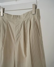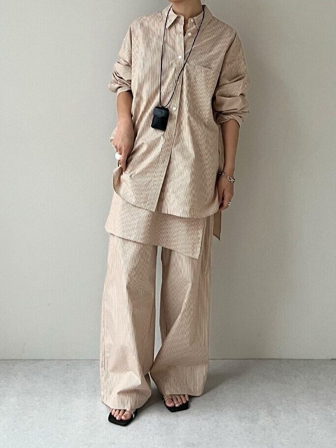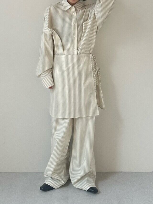 ストライプ柄のイージーパンツとラップスカートがセットになったレイヤードアイテム。動きのある柄使いが印象的な一着。パンツはタックが入ったストレートシルエットで後ろゴムで楽に履いていただけます。巻きスカートは、体に馴染むよう後ろにダーツを入れ、もたつかないように仕上げました。アイボリーはワントーン見えする3色の糸で織られたマルチストライプ。オレンジは2色のピンストライプに見えて、よく見ると細くもう1色ラインがあり、ほんのりと奥行きあるストライプになっています。同素材のStripe Over Shirtsとセットアップで着るのもおすすめ。ラップスカートは取り外し可能で、合わせるアイテムによって単品使いも可能です。
