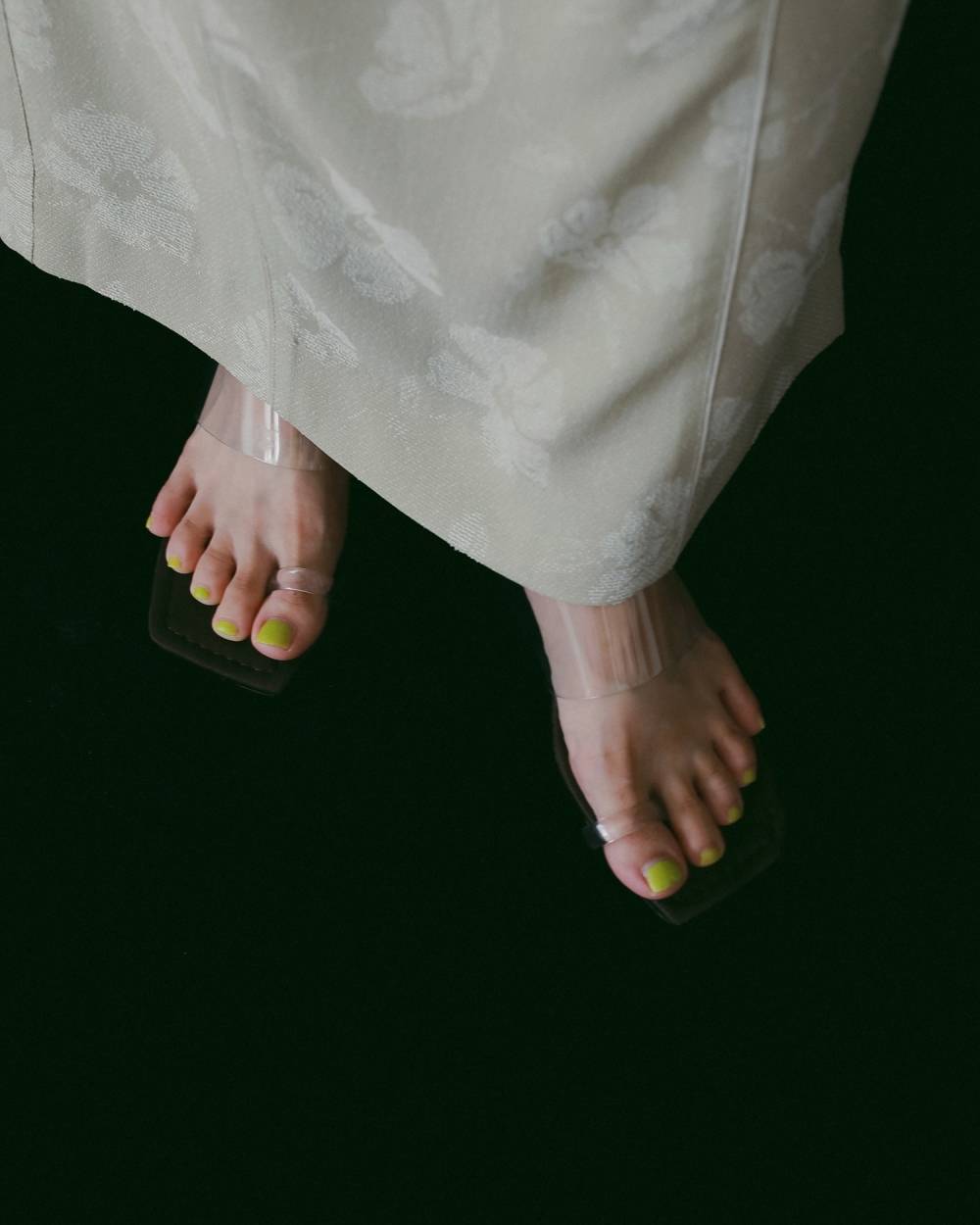 クリア素材とベロアのコンビが目を惹くヒールサンダル。太めのヒールと、しっかりと甲を覆ってくれる太めのアッパーに親指のホールデザインが、安定した履き心地に。ショートボトムやスカート合わせでしっかりとデザインを見せても、クリア使いが抜け感を添え、履くだけで足元を印象的に見せてくれます。フルレングスのパンツと合わせた際も、ちらっと覗く親指のデザインがポイントに。インソールからヒールにかけてはベロアで、肌触りの良さも魅力。スクエアトゥでシックな雰囲気を纏えます。