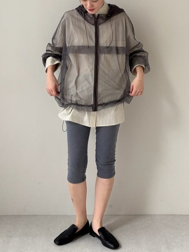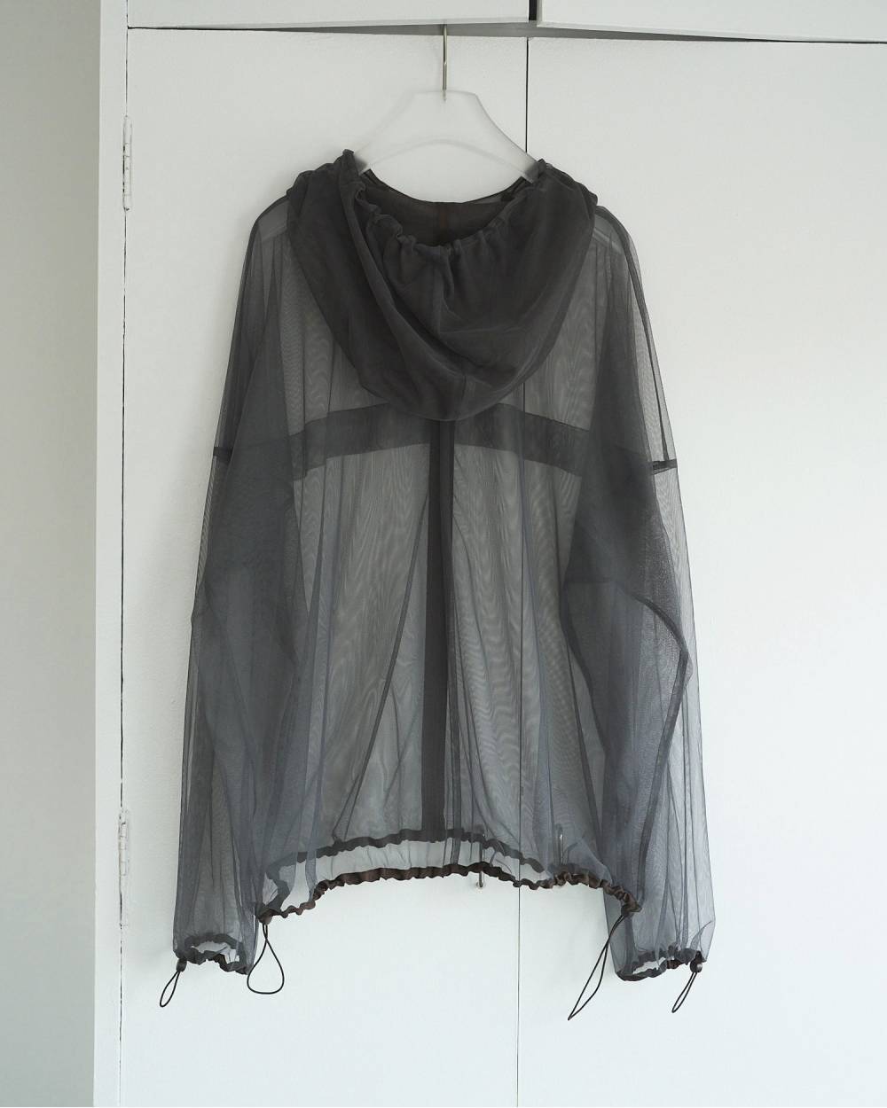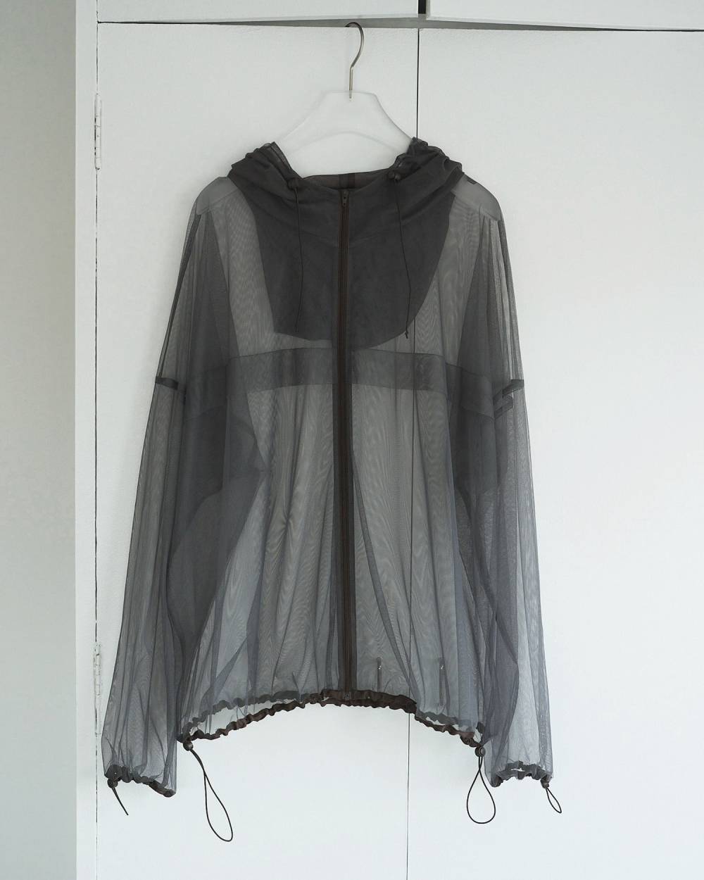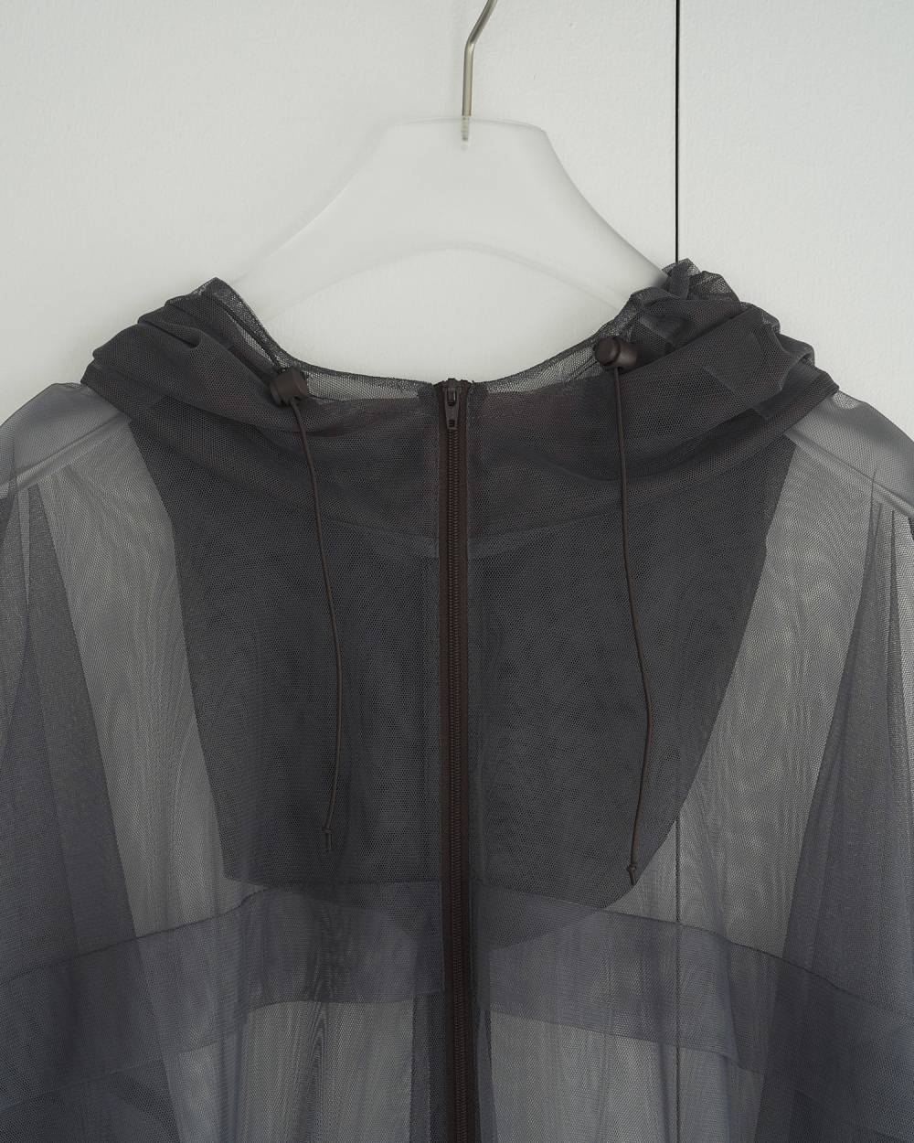繊細なチュール素材を使用し、オーバーサイズで仕上げたZIPブルゾン。配色にした袖口や裾の別布パイピングデザインや、付属使いもポイント。フードの内側は、付属の色と合わせて、配色のチュールを使用することで、2色が優しく混ざりニュアンスある仕上がりになっているのもこだわり。シンプルなジャケットのインナーとしてレイヤードするだけで、一気にスタイリングが映える一着。トップス感覚でプルオーバーとして着たり、Tシャツやラフなタンクを敢えて透かして見せるのもおすすめです。