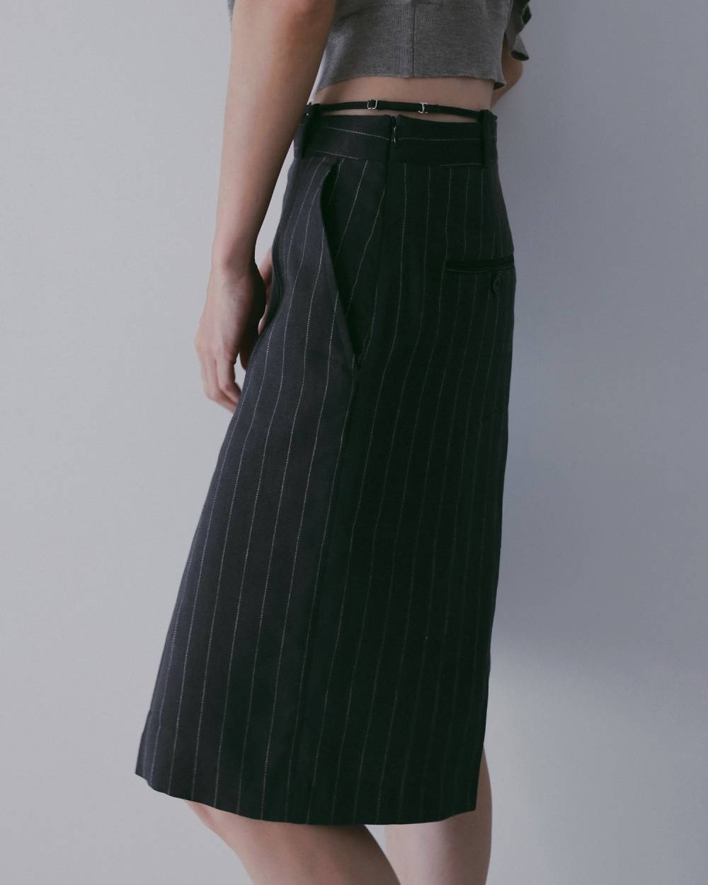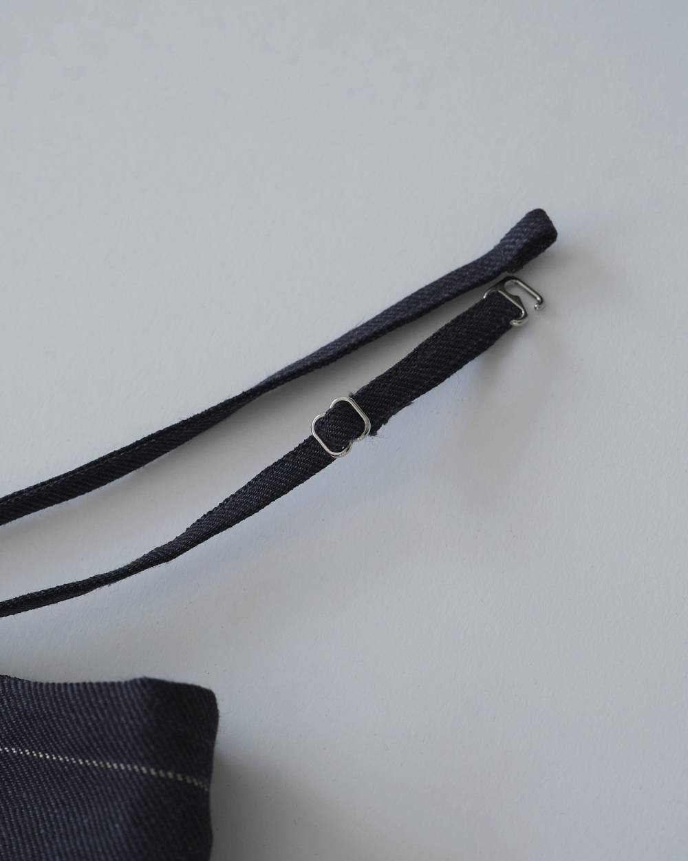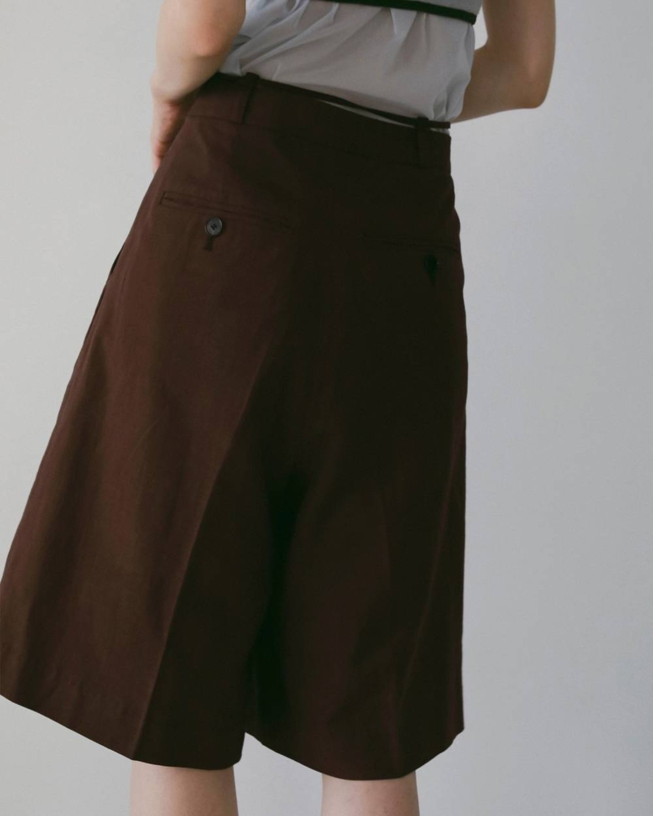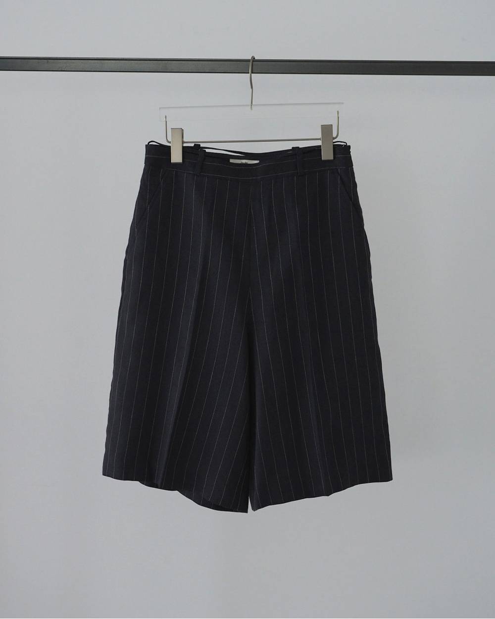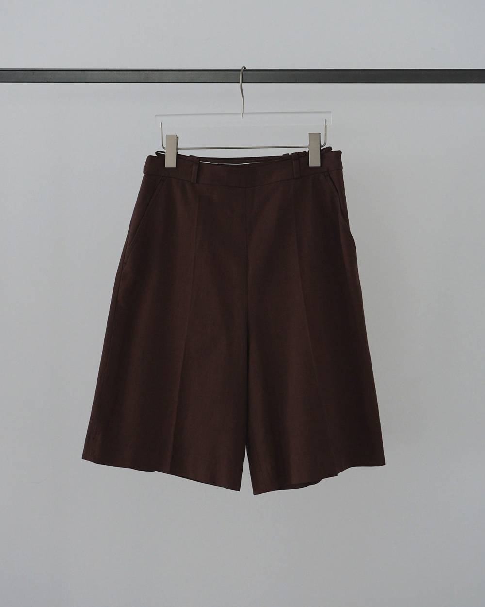 リネン素材を使用したハーフパンツ。オリジナルで織り上げた薄手の軽やかなリネン素材。無地のブラウンとストライプ柄のネイビーの2色展開。裾にかけて少し広がり、体から優しく離れたシルエット。センタープレス入りで、スッキリと着ていただけます。ウエストのベルトディテールがポイント。トップスをインしたり、ショートトップスと合わせて、ベルトを見せたスタイリングも楽しんでいただきたい一本。同素材のOver Linen Jacketとセットアップで着るのもおすすめです。