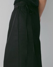 透け感のあるダンボールニット素材を使用したスカート。ハリのある素材でつくる、体から優しく離れるストレートライン。膨らみある生地が生む曖昧なシアー感は、ミニマルな装いにほんのりとニュアンスを添えます。別布を使った、ウエストのリボンデザインもポイント。フルレングスのパンツを合わせて、パンツとスカートのさりげない境界線を楽しんだり、タイトなレギンスを敢えて透けさせるのもおすすめ。長めのトップスと合わせて、思いっきり透け感を楽しんだコーディネートにしたりと、レイヤードでモードな着こなしを演出できる一枚です。
