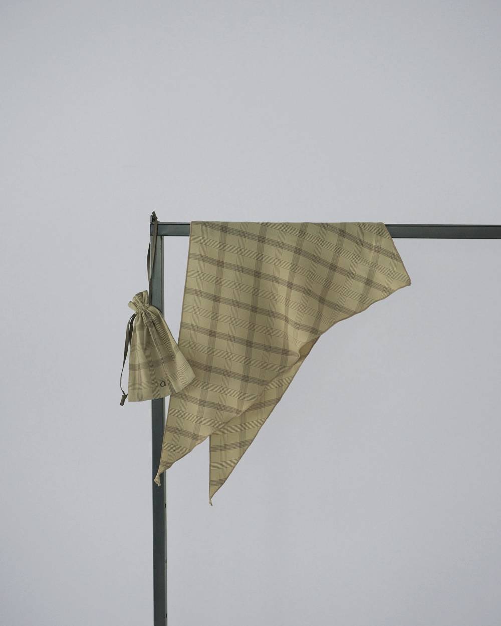 チェック柄が目を惹くをスカーフ。三角形型で、頭に巻くだけでこなれた着こなしに。日本の桐生で織られたオリジナルのチェック生地です。シンプルなスタイリングにも映え、トレンド感あるセンスを添えます。