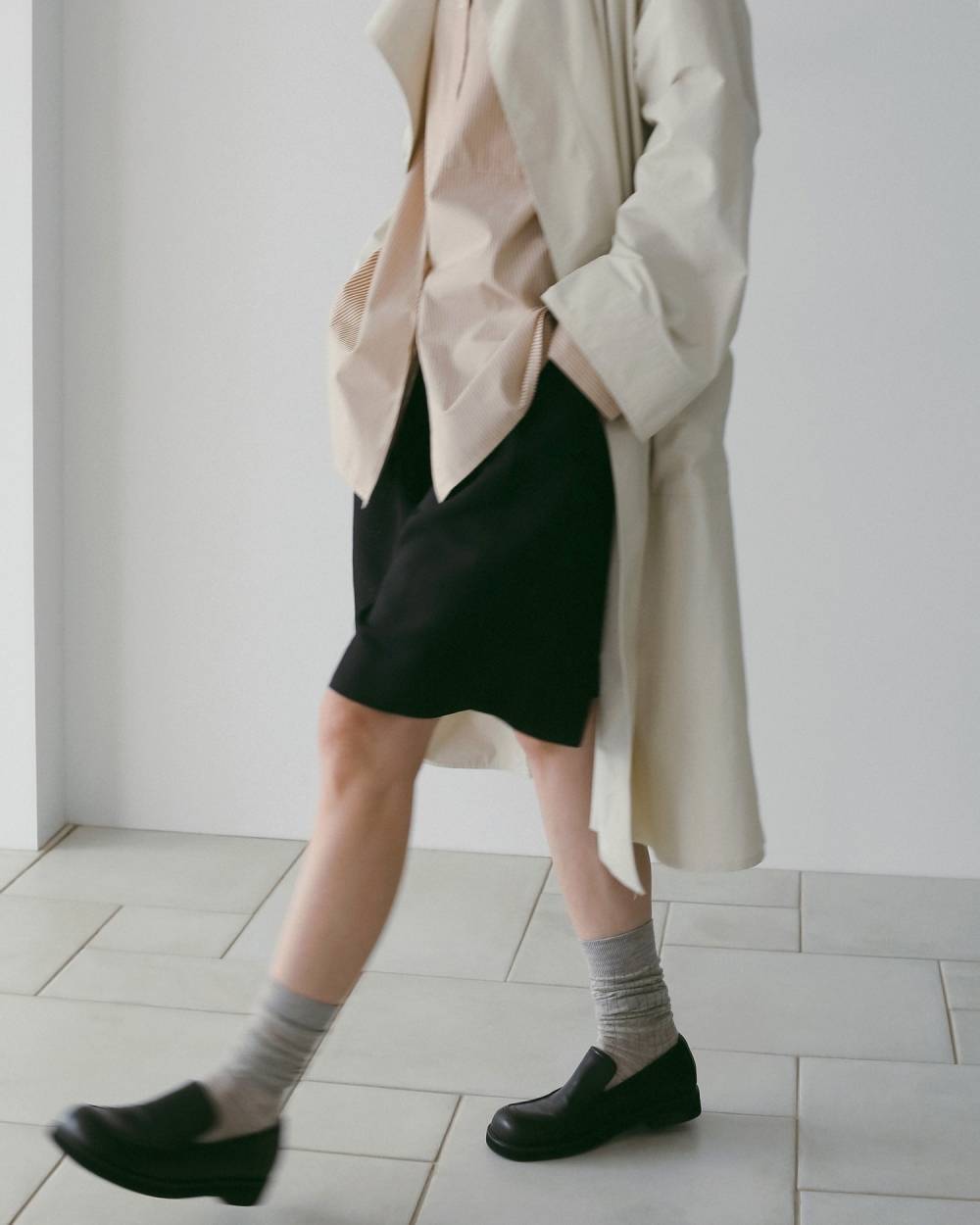 透け感のあるからみ織り素材を使用したハーフパンツ。タックを入れ、裾にかけて少し広がったシルエット。膝くらいまでの長め丈で、大人っぽく着用いただけるハーフパンツに仕上げています。スニーカーやローファーに靴下を合わせて、こなれた足元のバランスに。オーバーなトップスとも、コンパクトなトップスとも好相性で、スタイリングに軽やかさを添えます。同素材のWork Pocket Shirtsとセットアップで着ていただくのもおすすめです。