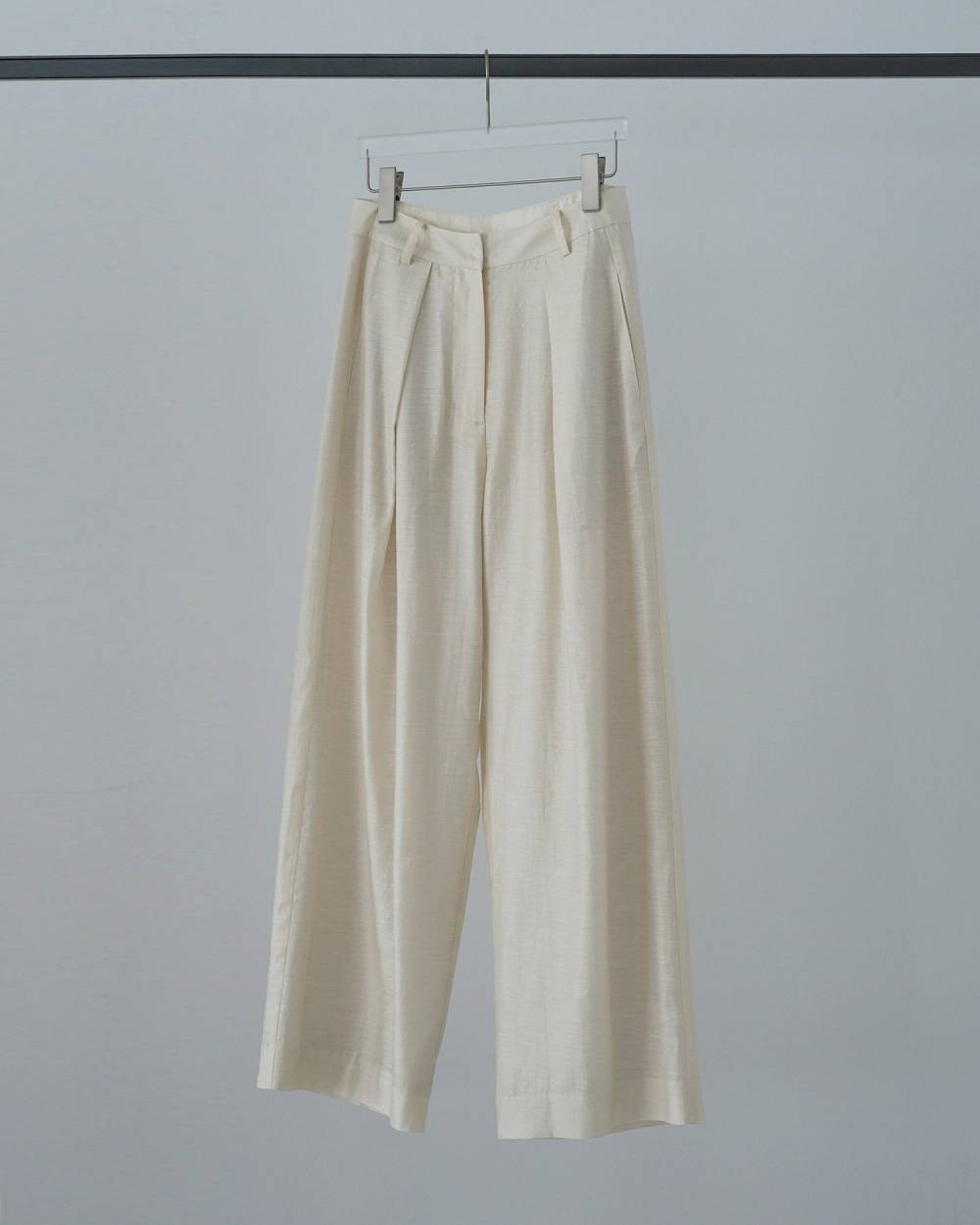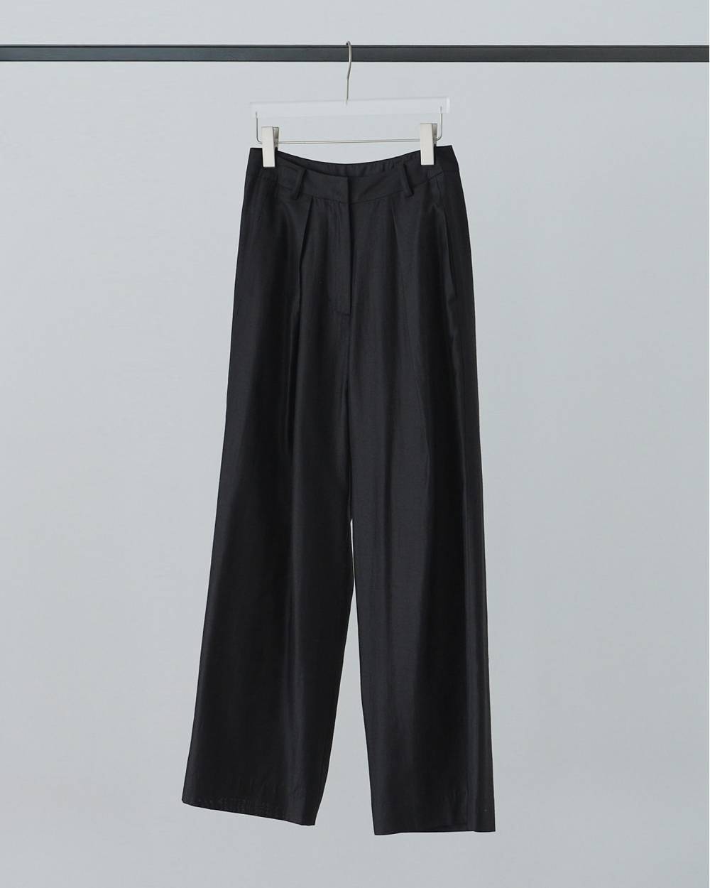 程良く光沢のあるシアー素材を使用したタックパンツ。春夏らしいナチュラルな風合いで、涼しく着ていただける一枚。軽やかに着れる透け素材とすっきりと見えるワイドシルエット。ワンピースなどとのレイヤードにもおすすめです。幅広いスタイリングに着回せるミニマルなデザイン。合わせるアイテムを選ばないベーシックなブラックとアイボリーの2色展開です。