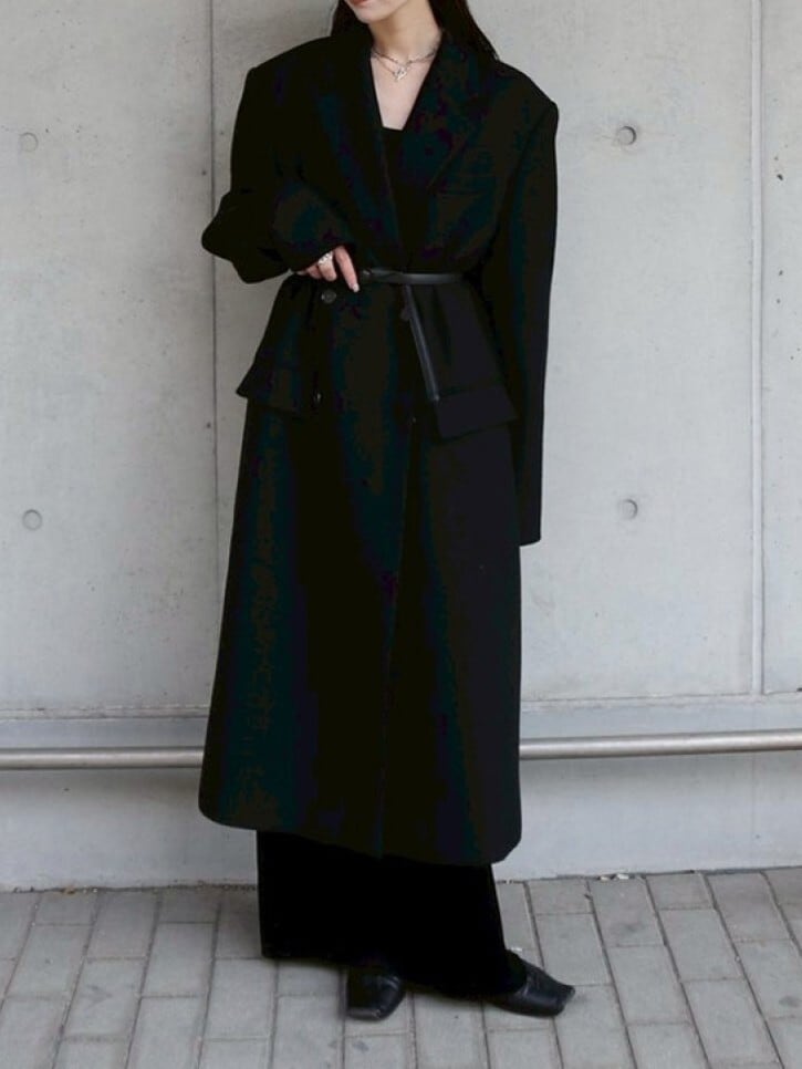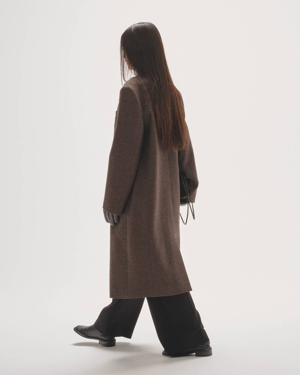 存在感のある厚手の肩パッドを施したオーバーショルダーシルエットのコート。上質なウールの光沢と、杢調の風合いが際立つツイル生地を使用しました。シンプルなスタイリングに合わせるだけでマニッシュな印象に。ダークブラウンにはイエローの糸で留めたボタン、新色ブラックにはブルーの糸を使用し、さりげないディテールにもこだわった一着です。