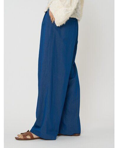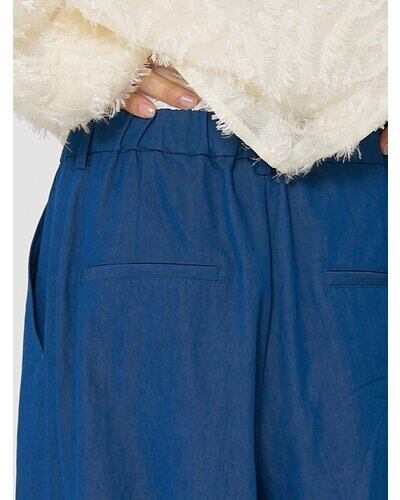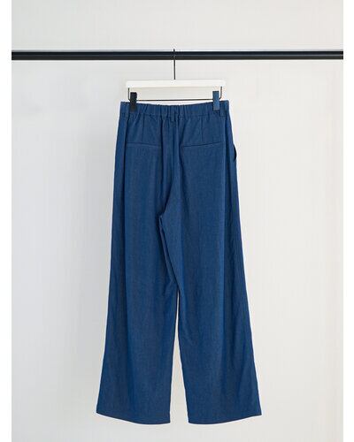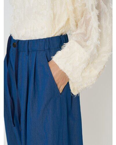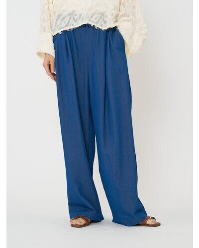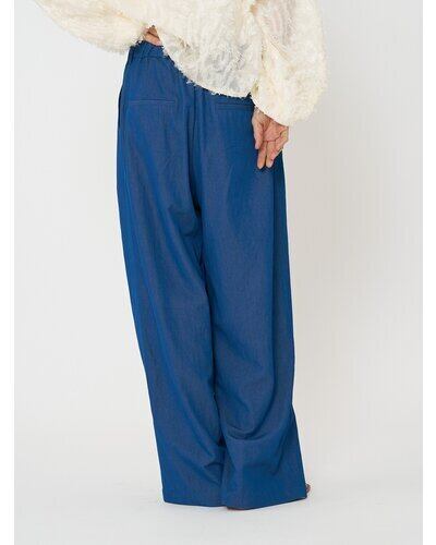 なめらかなとろみ感が心地良いシャンブレーのレーヨンナイロン素材を使用したワイドシルエットのスラックスパンツ。