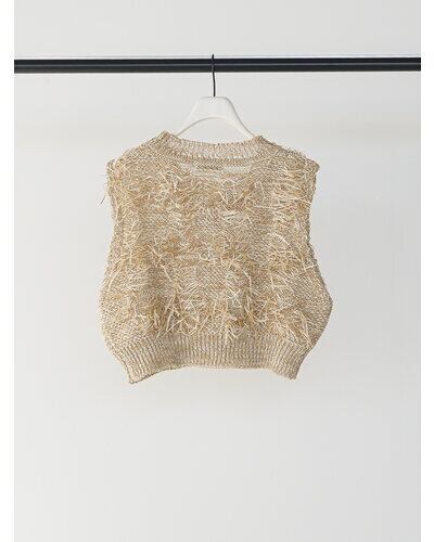 それを部分的にカットしフリンジを作っている、印象的な編み地のニットベストです。