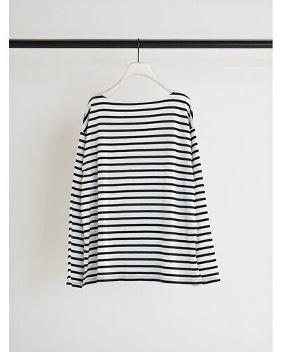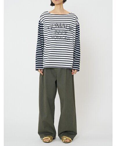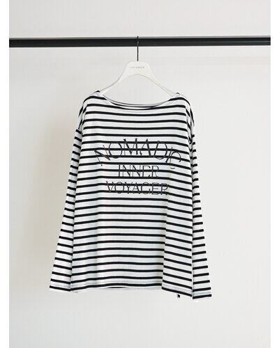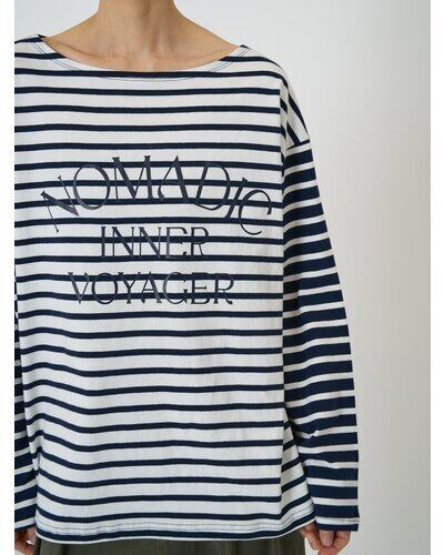 ボーダー×ロゴの掛け合わせが、程よくカジュアルな印象を与え、1枚でコーディネートが決まりやすい万能TOPS。プリントの色がボーダーと同色なので、そこまで主張せずモードな雰囲気にまとめました。シャツやジャケットのインナーとしても映えること間違いなし。