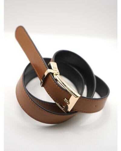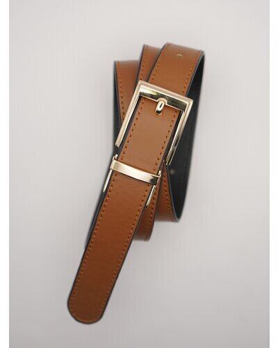 バックルを180度回転すると表裏両面使えるリバーシブル仕様の2WAYベルトです。1本で2本分楽しめるので、その日の気分やコーディネートに合わせてご使用いただけます。お色はブラウン×ブラック、形もシンプルなので様々な洋服に合わせやすい万能ベルトとなっております。ブラウン面には「CHIGNON」の押印入り。