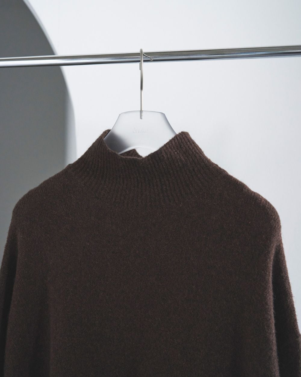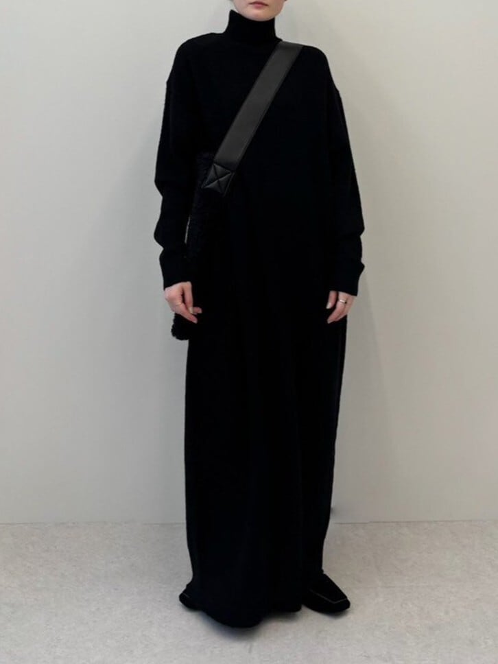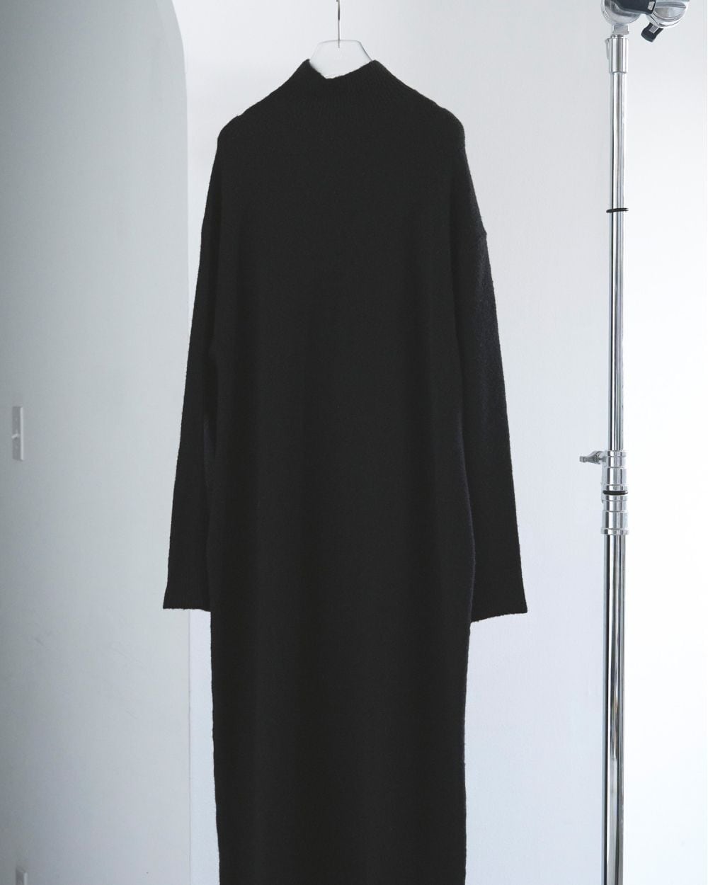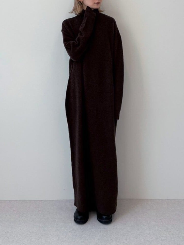 アルパカ混の柔らかく膨らみのある編み地で仕上げたニットワンピース。タートルネックで仕上げたロング丈が大人っぽい一枚。腰回りに少し丸みを持たせ裾にかけて細くなったコークーンシルエット。ゆるっとしたオーバーなサイジングでラフに着ていただけます。上からベルトをつけて、メリハリを出したスタイリングもおすすめです。