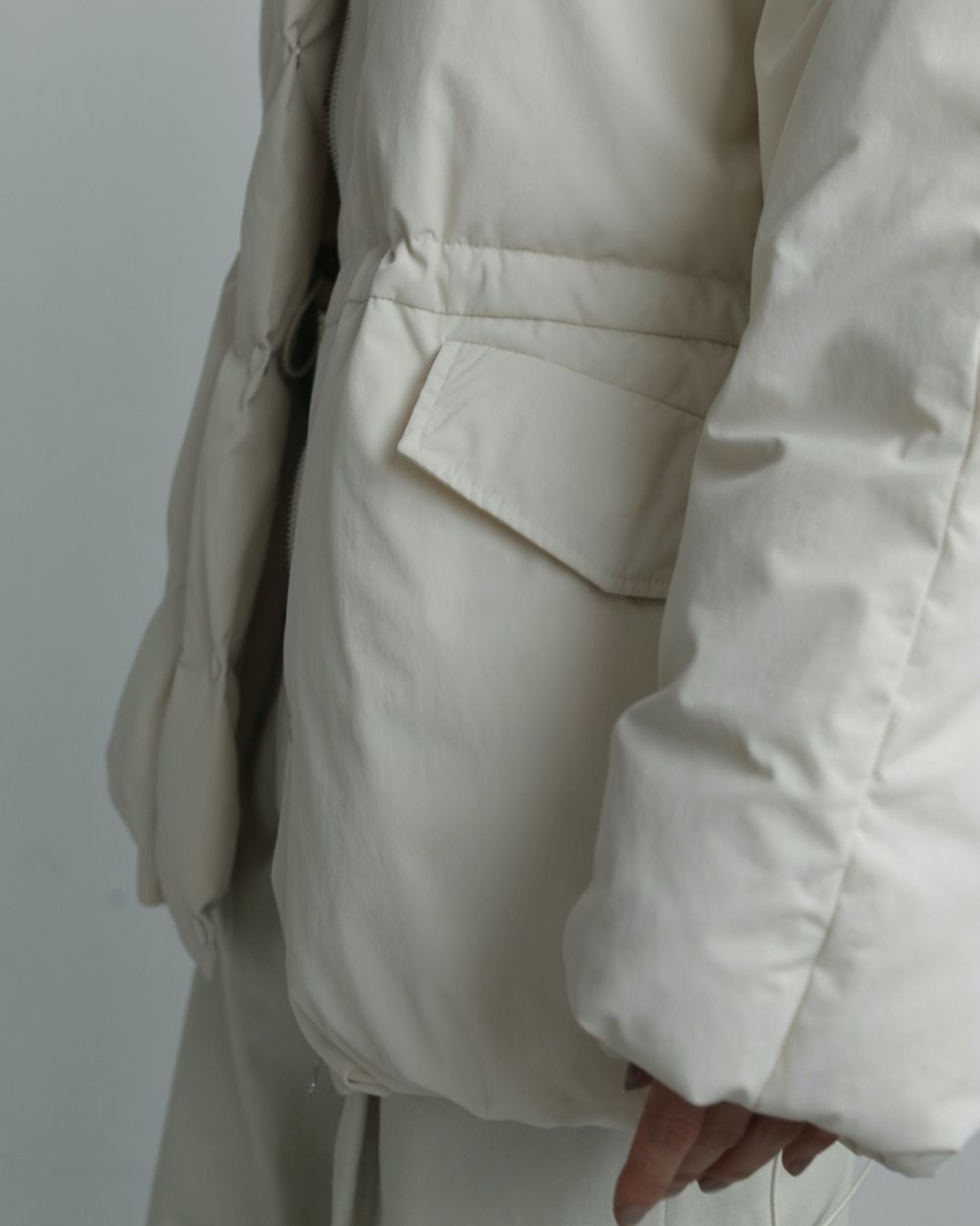 しなやかでマットな質感が上品見えする綾織素材で仕上げたスタンドカラーのダウンコート。腰回りがしっかりと隠れるミドル丈で、幅広いボトムと合わせやすく、ウエストや裾のドロストでシルエットをアレンジしていただけます。袖下と脇線に共布のパイピングを挟み込んでいるのもポイント。ベーシックなブラックと冬から春の始まりの寒い季節にも明るいトーンがマッチするアイボリーの2色展開です。
