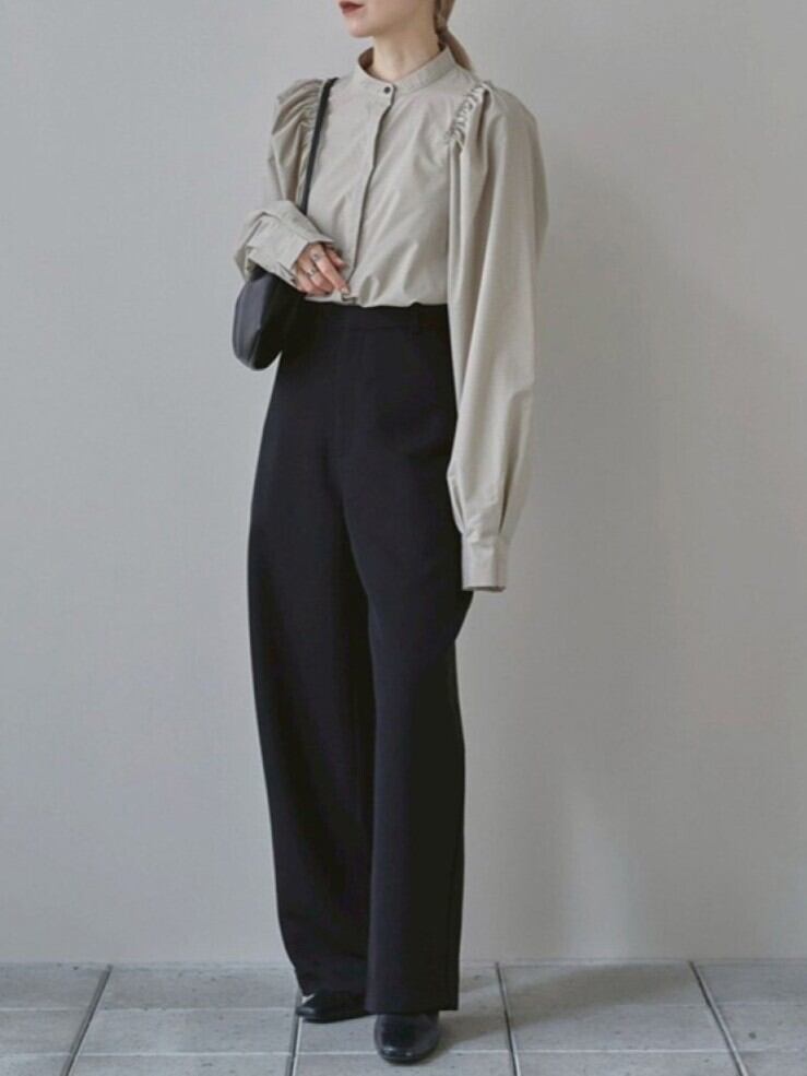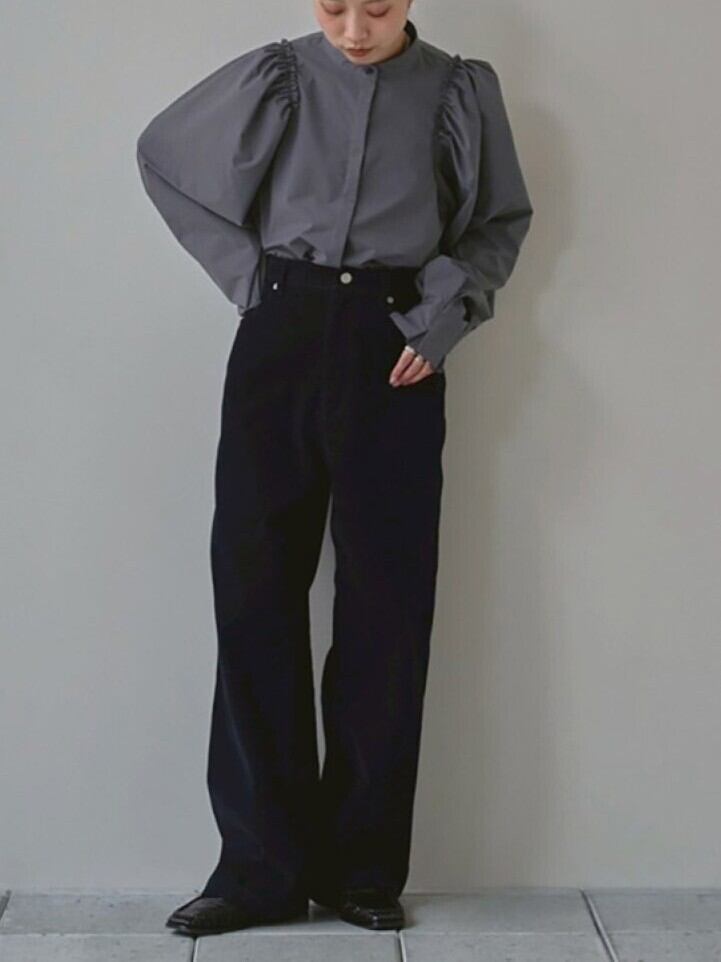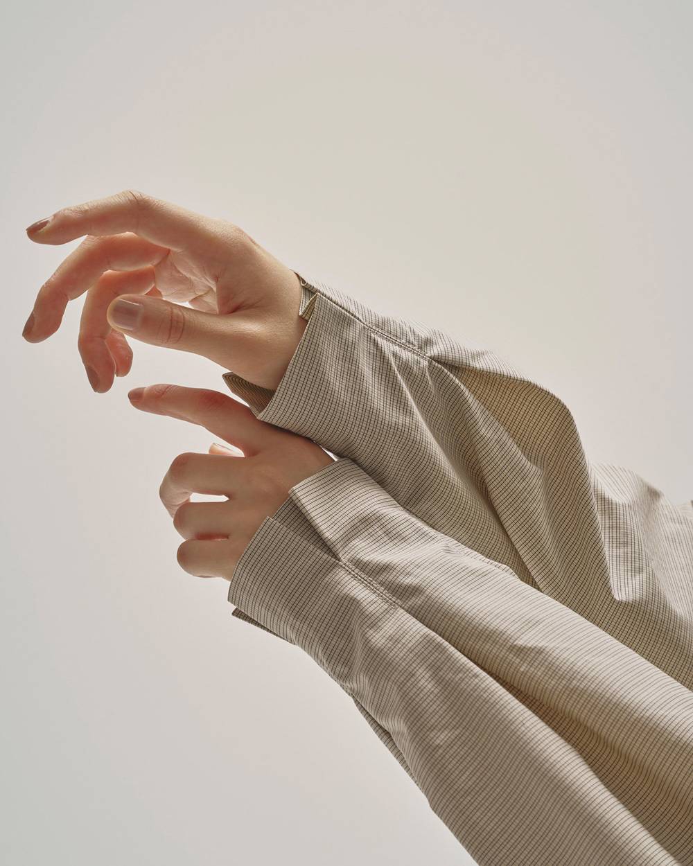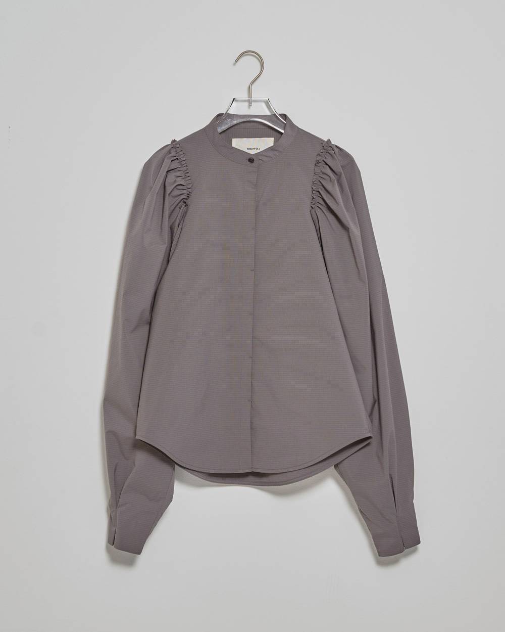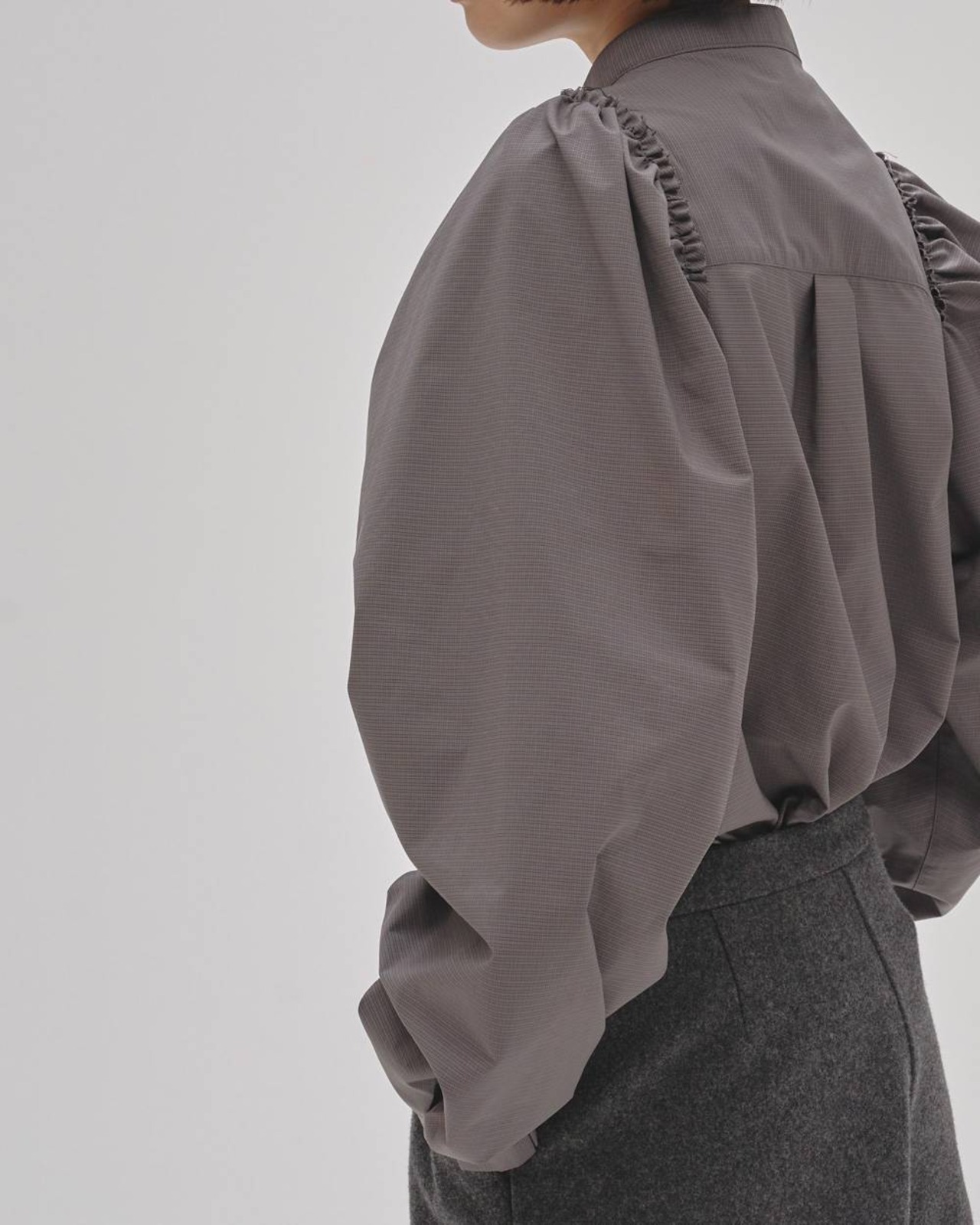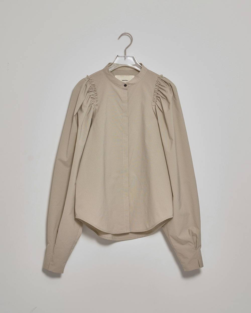 ほどよいハリとなめらかな表情を併せ持つタイプライター生地を使用したブラウス。控えめなチェック柄が奥行きを生み、上品な印象を引き立てます。カットオフ仕様のアームホールやギャザーをふんだんに入れたパフスリーブなど、ディテールに拘った一着。コンパクトな身頃とのバランスが美しく、ボトムスにインしたメリハリのあるスタイリングがおすすめ。