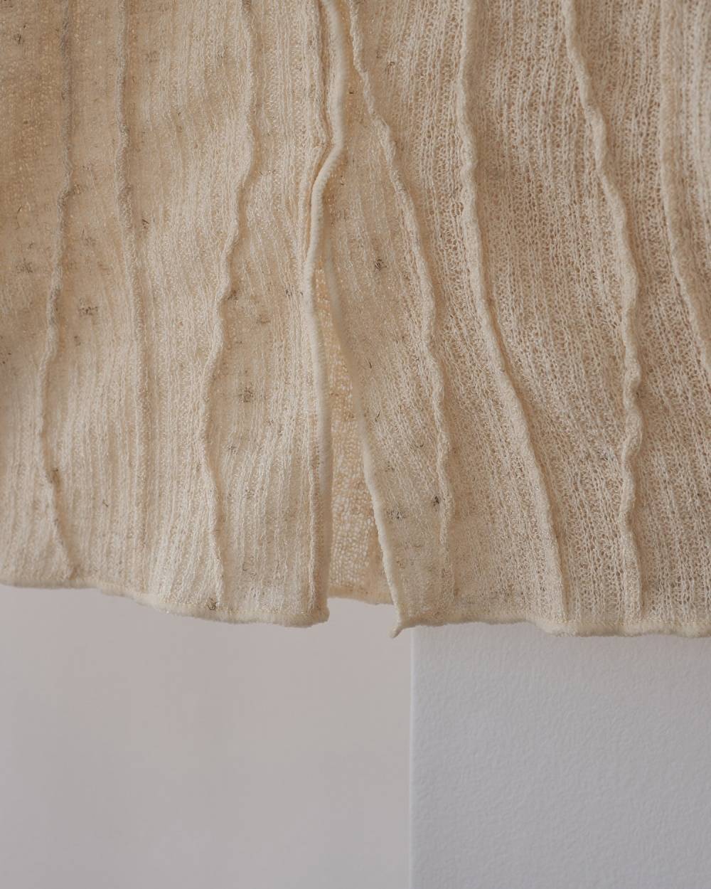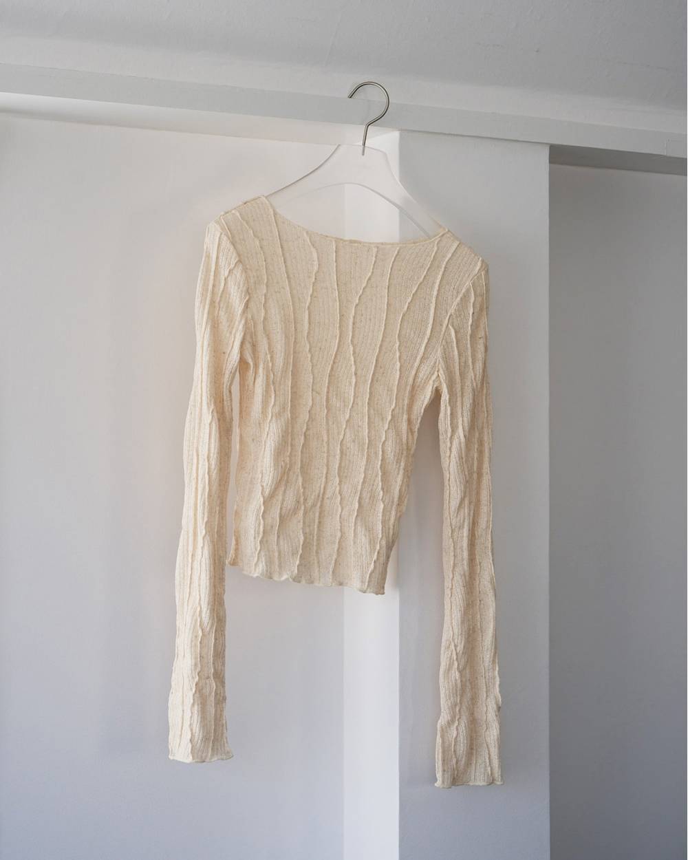 ランダムに施したピンタックが表情を生む、ニットライクな素材のコンパクトトップス。すっきりとしたボートネックに、ほのかにフレアを効かせた長めの袖が女性らしさを引き立て、程よい抜け感を演出。バックのセンタースリットは、動きのあるアクセントをプラスし、シンプルながら、着るだけで自然と着映えするトップスです。ショート丈で、ワイドパンツやラフなカジュアルボトムとバランス良く着ていただけます。