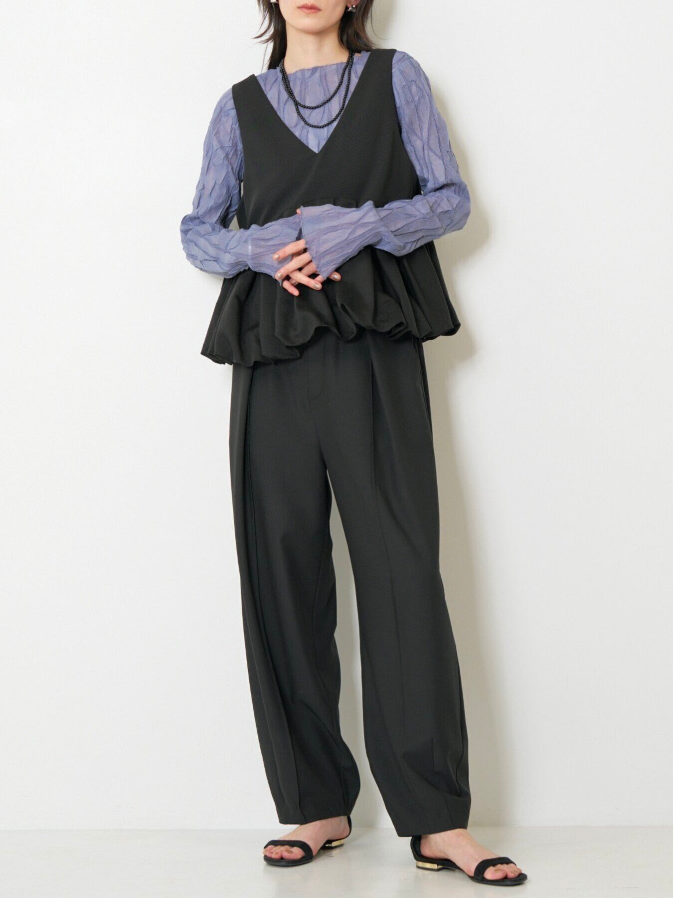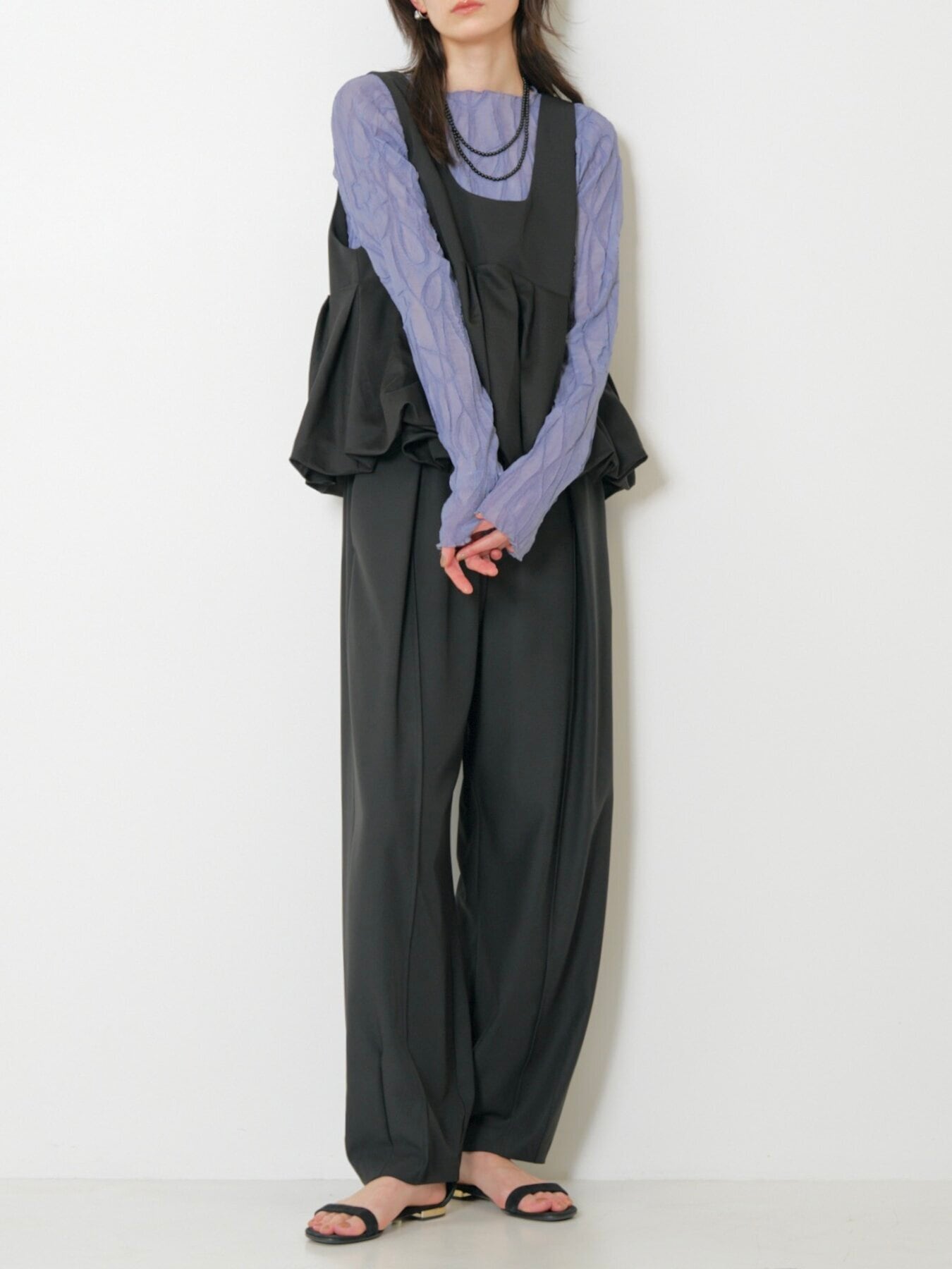 シンプルなスタイリングに重ねるだけで、華やかな奥行きをプラスしてくれます。