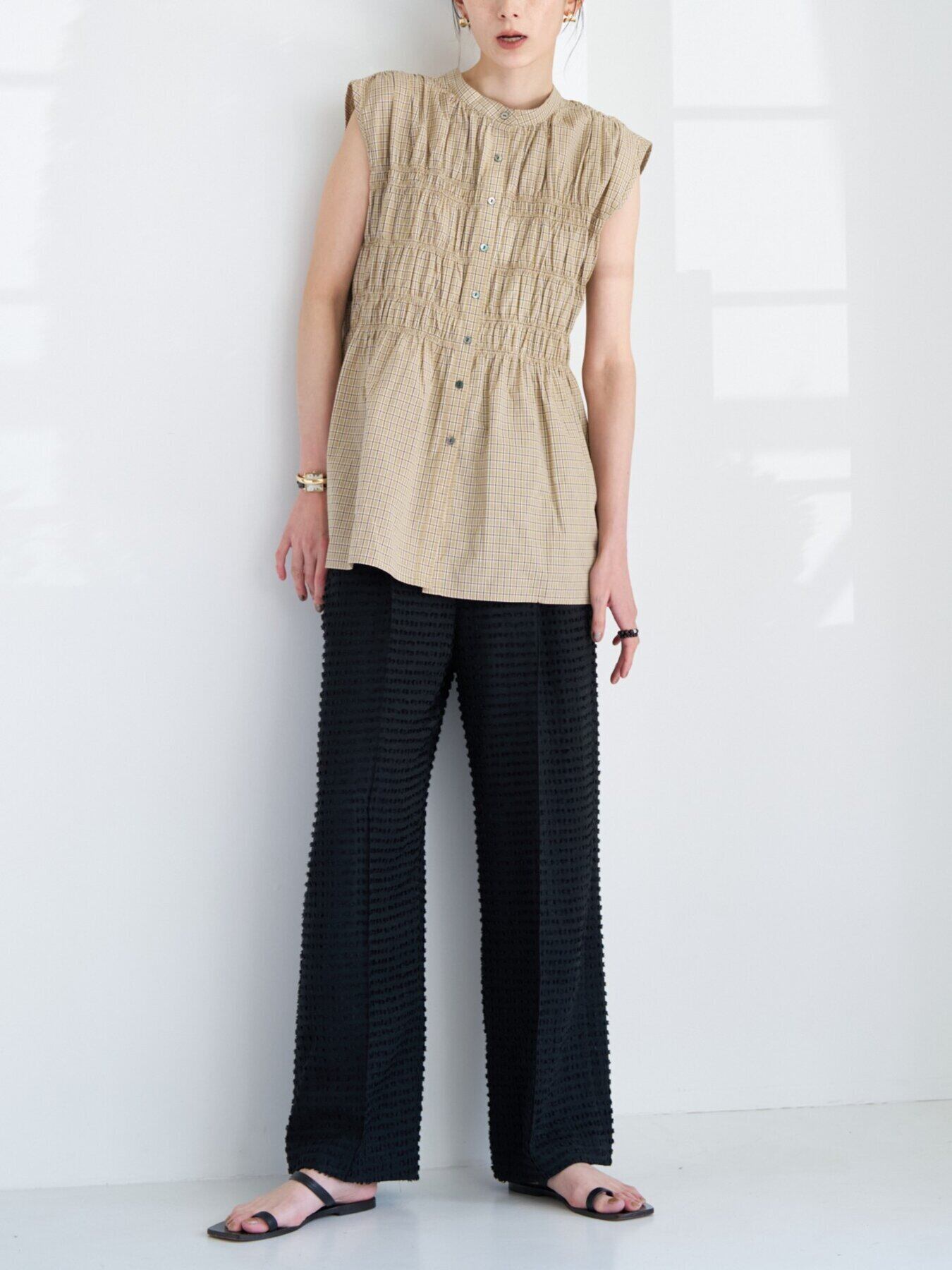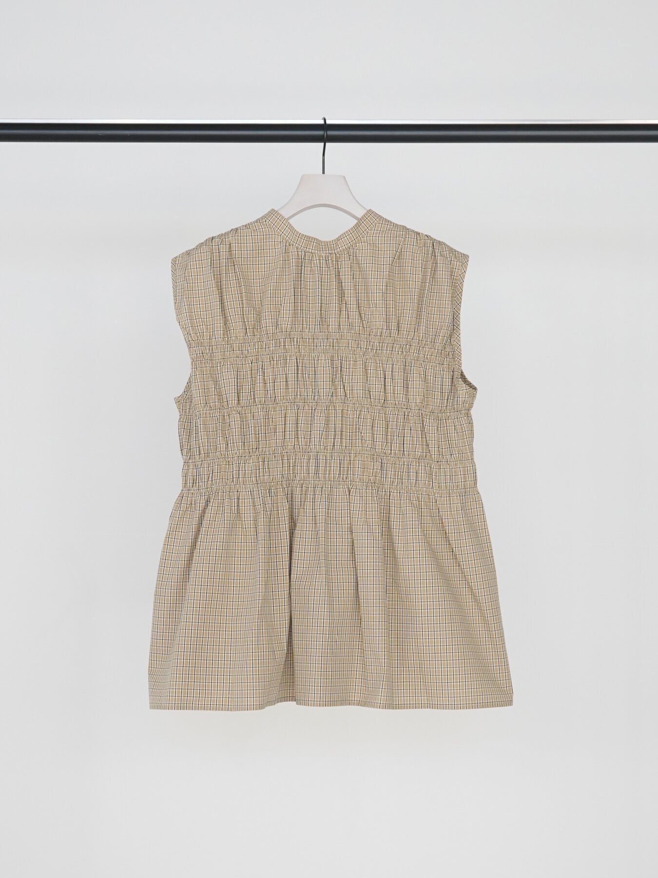 やわらかなコットン素材を使用した、チェック柄のシャーリングブラウス。