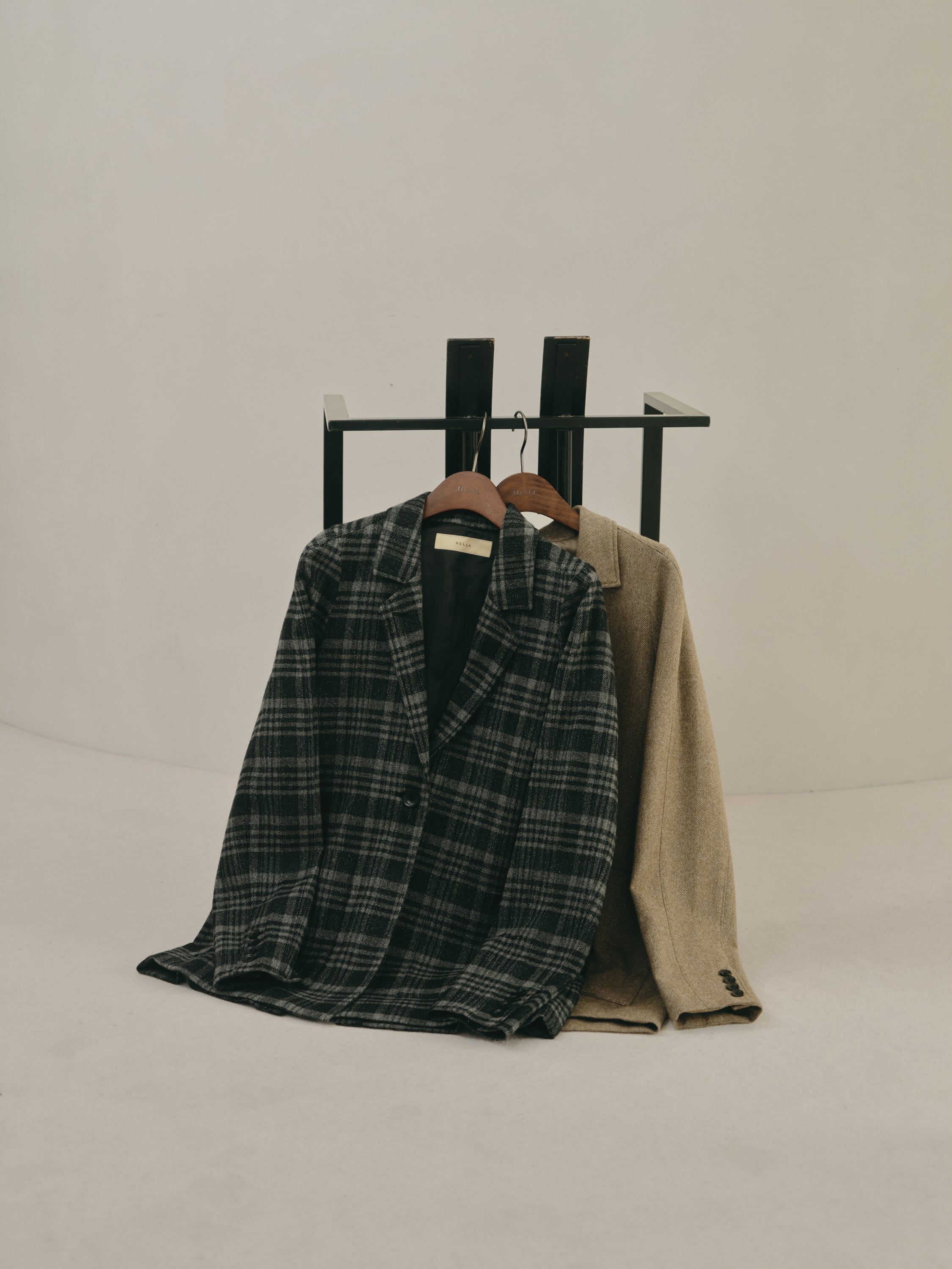 ベージュは無地見えするツイル、チャコールは落ち着いたチェック。