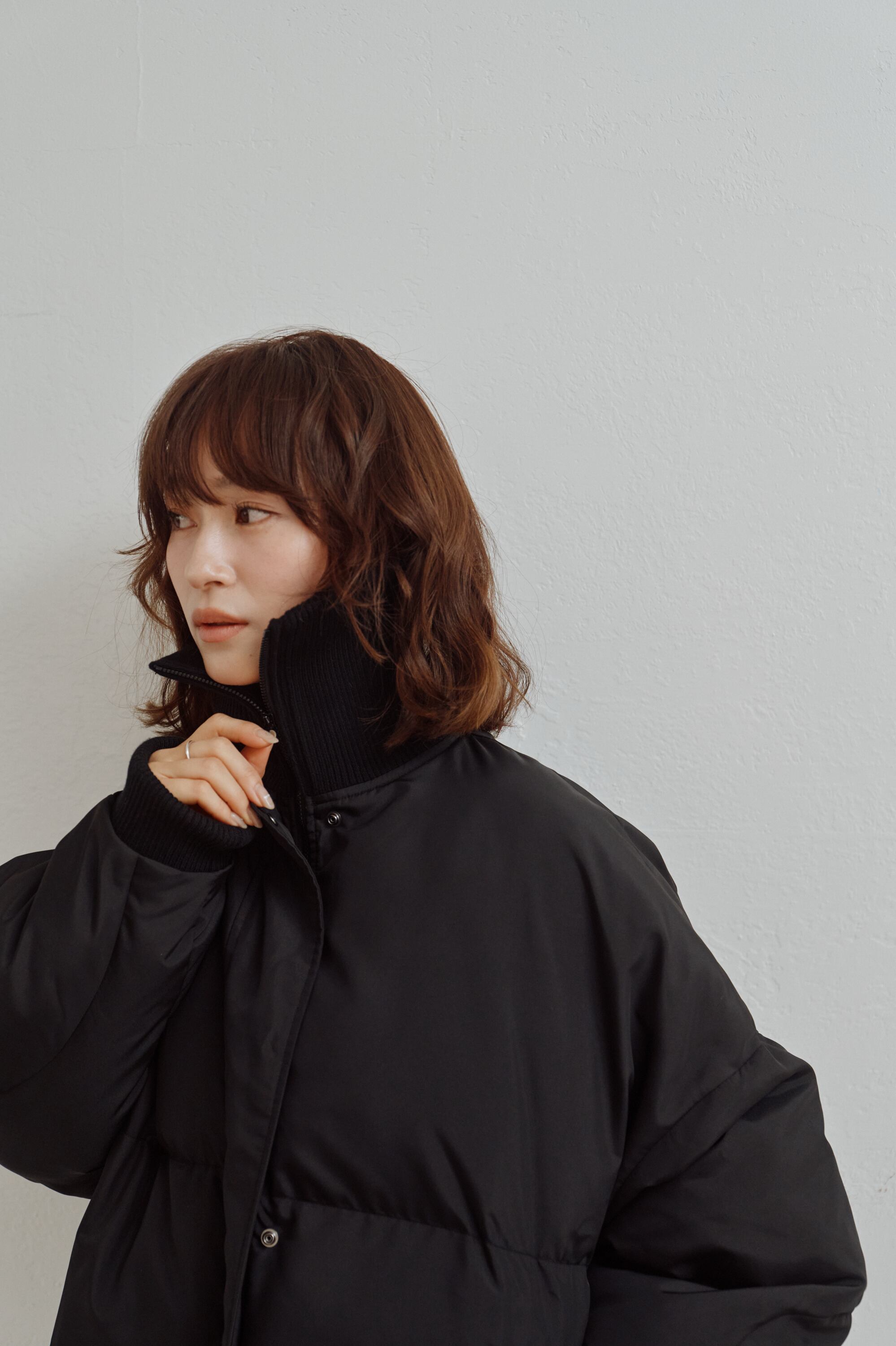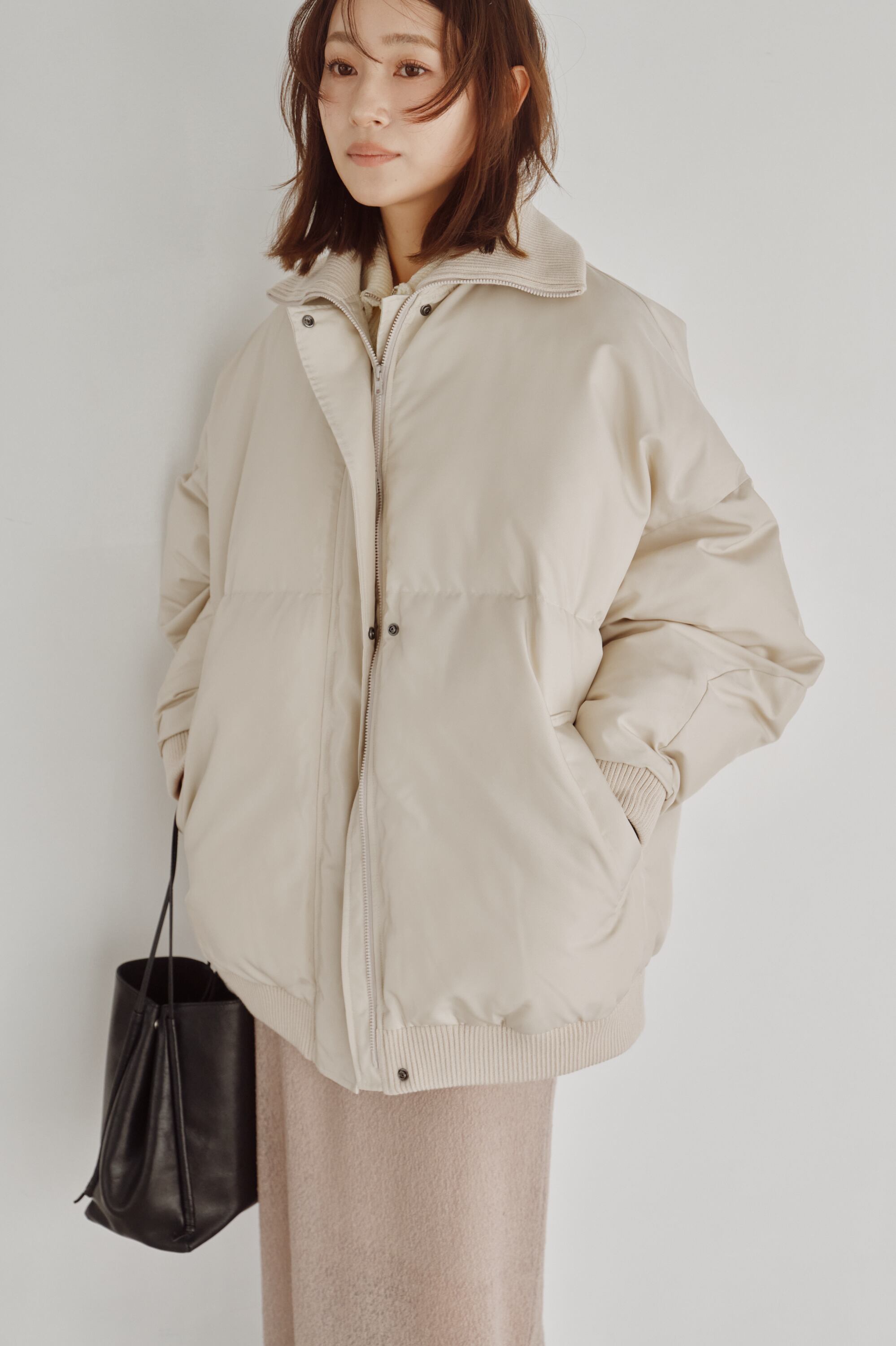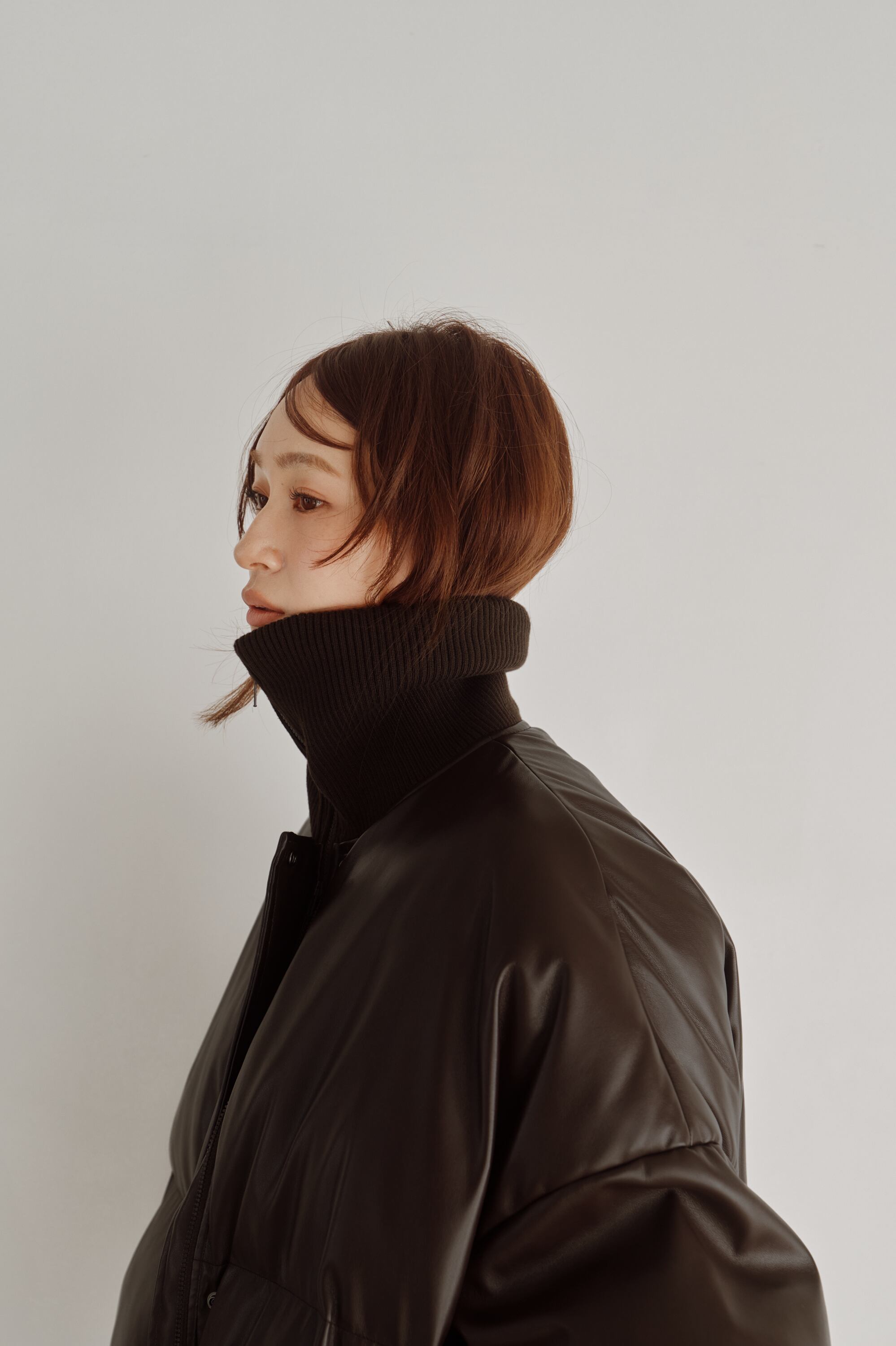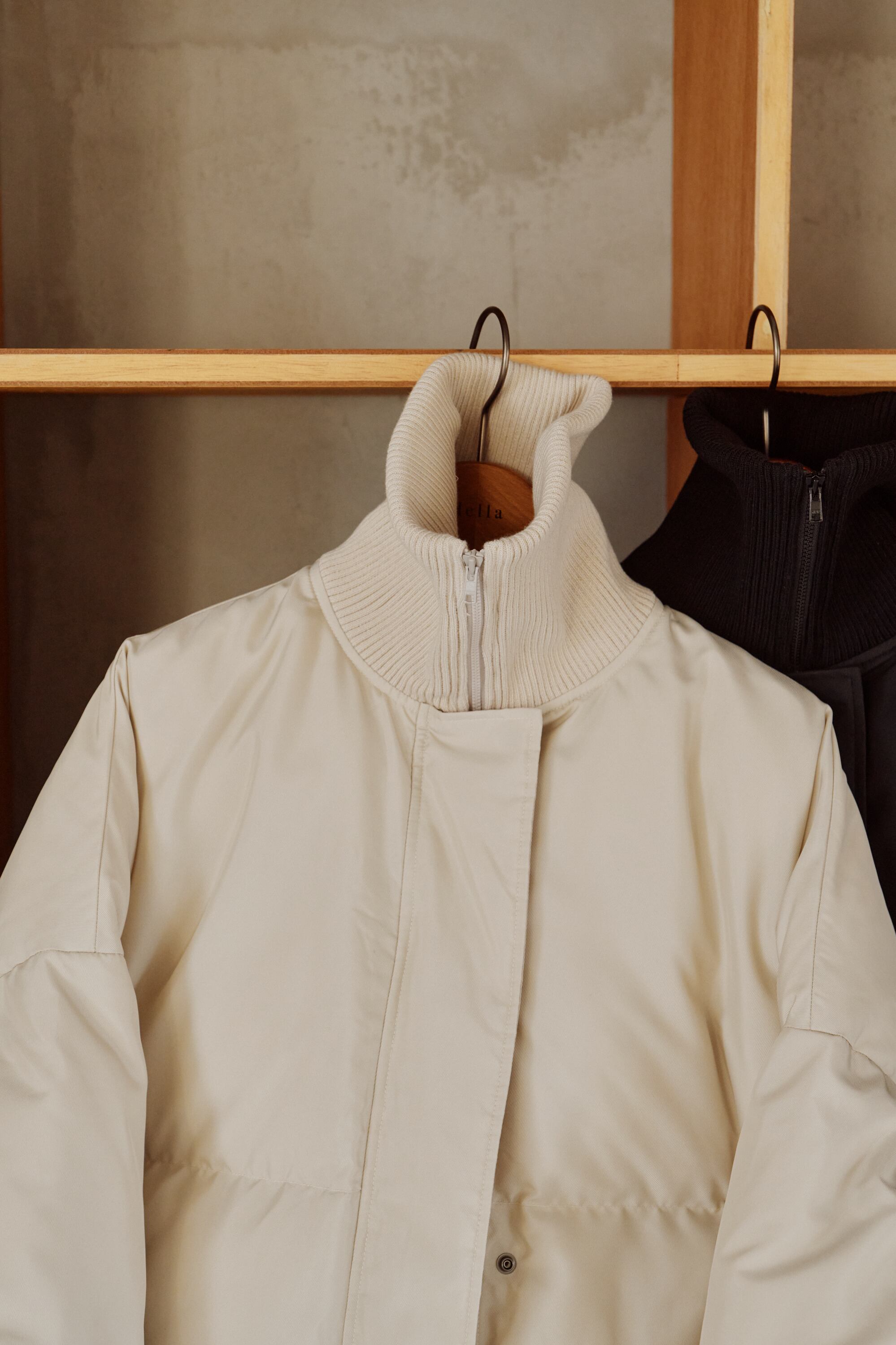 カジュアルになりがちなパッディットコートを、高めに設定した編み立てのハイネックでシックな印象に仕上げました。