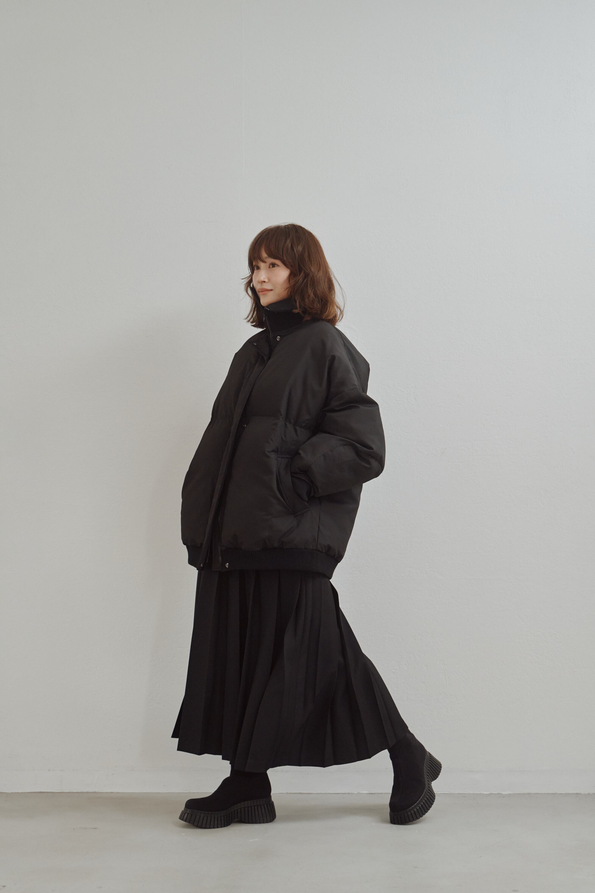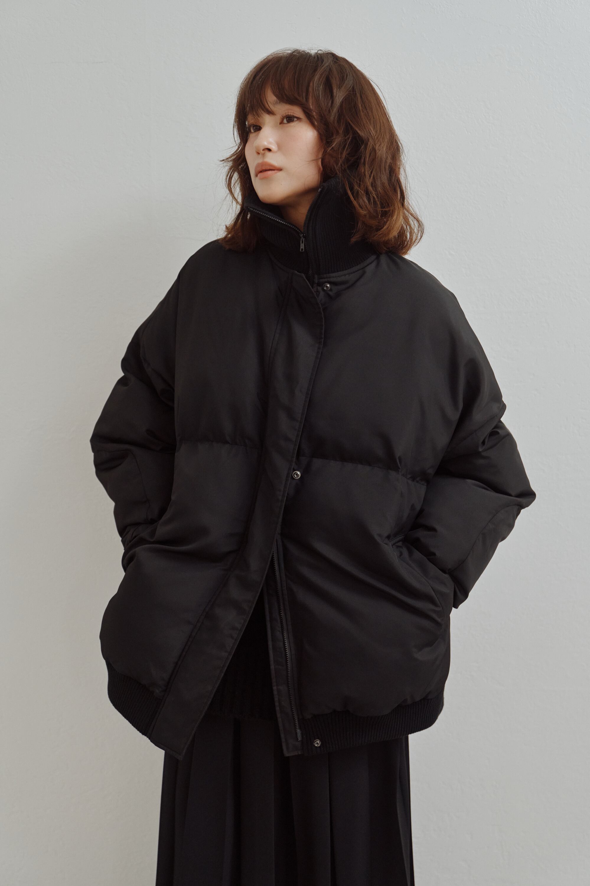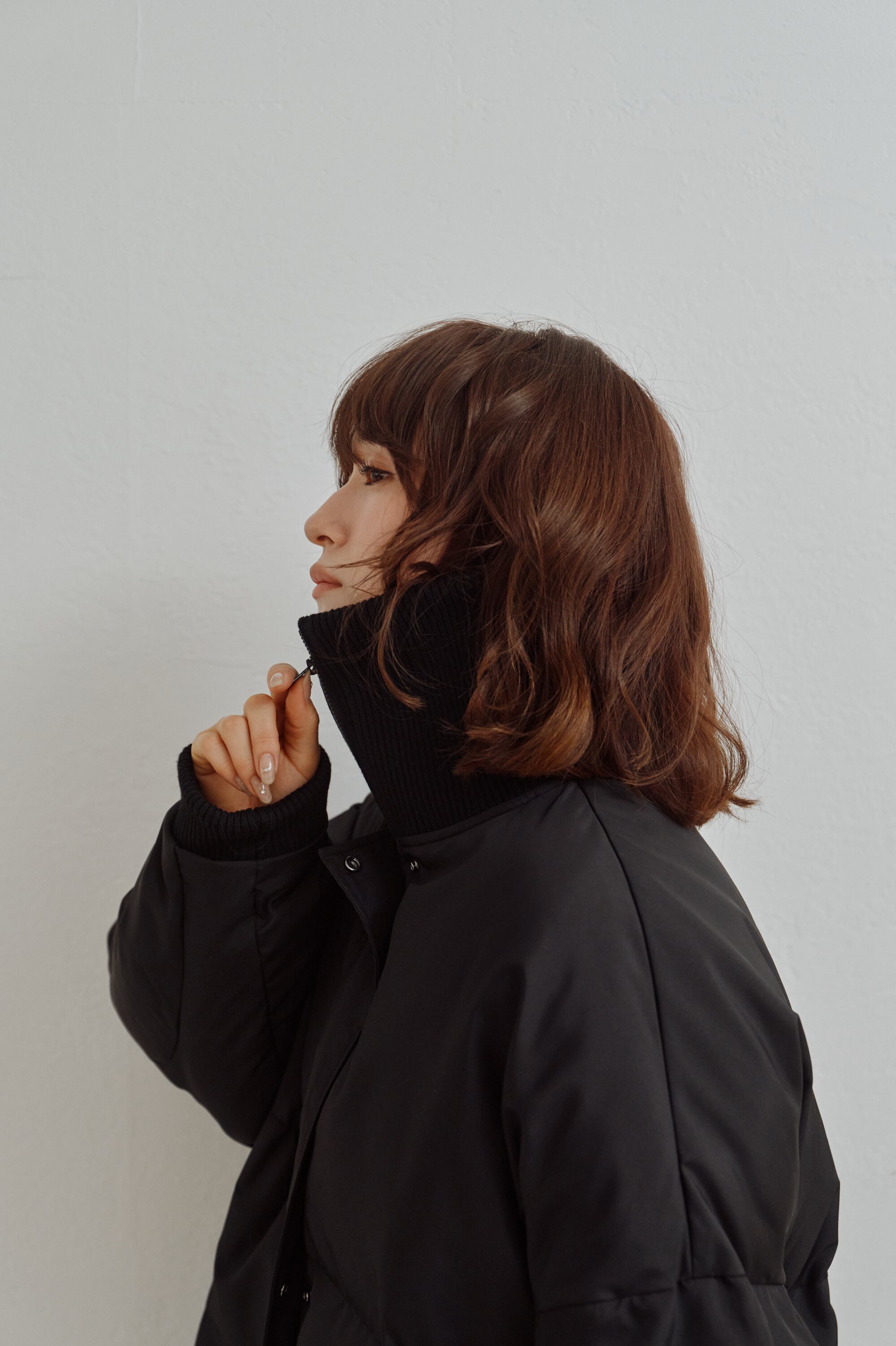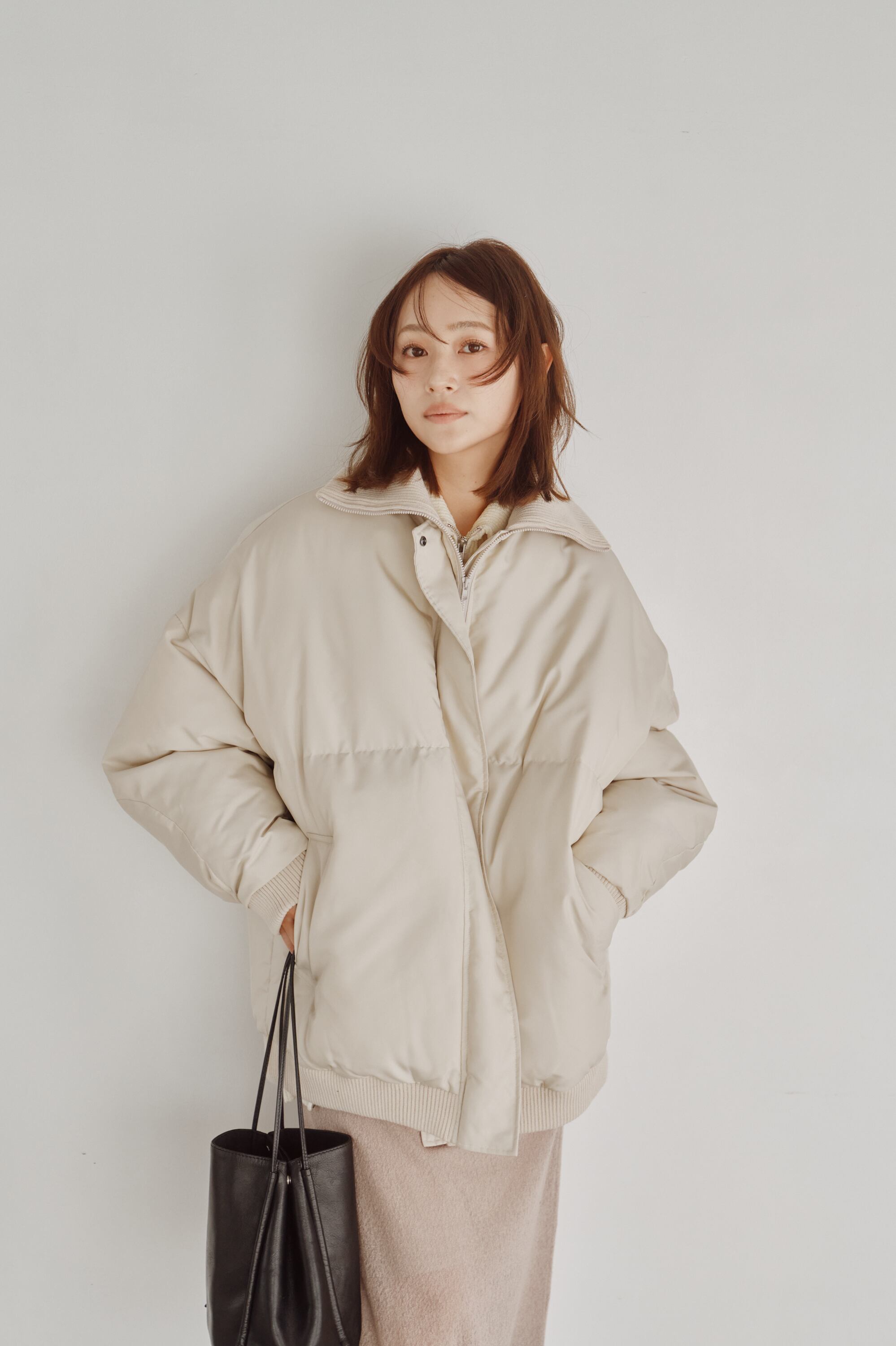 カジュアルになりがちなパッディットコートを、高めに設定した編み立てのハイネックでシックな印象に仕上げました。