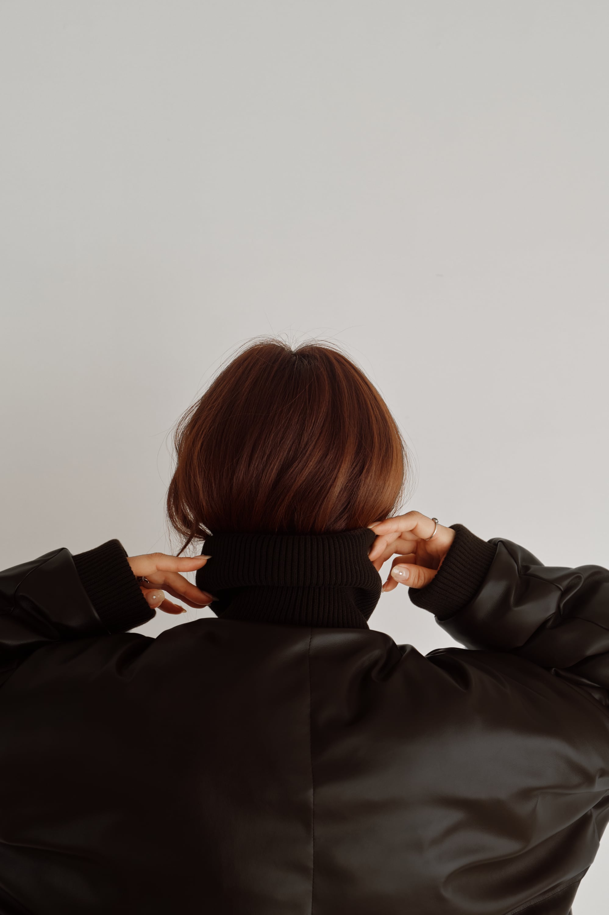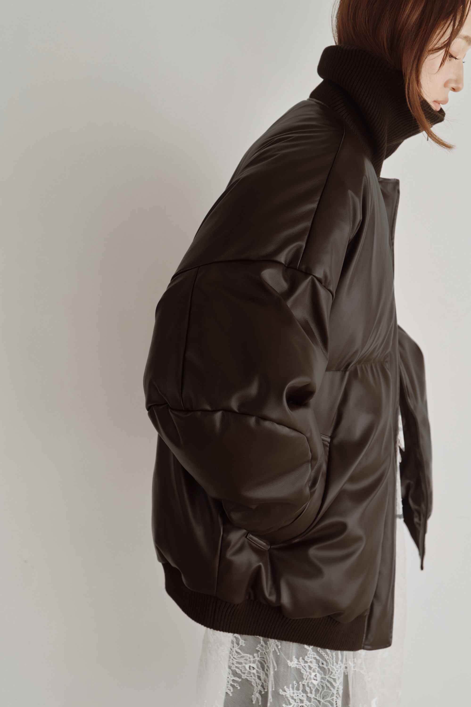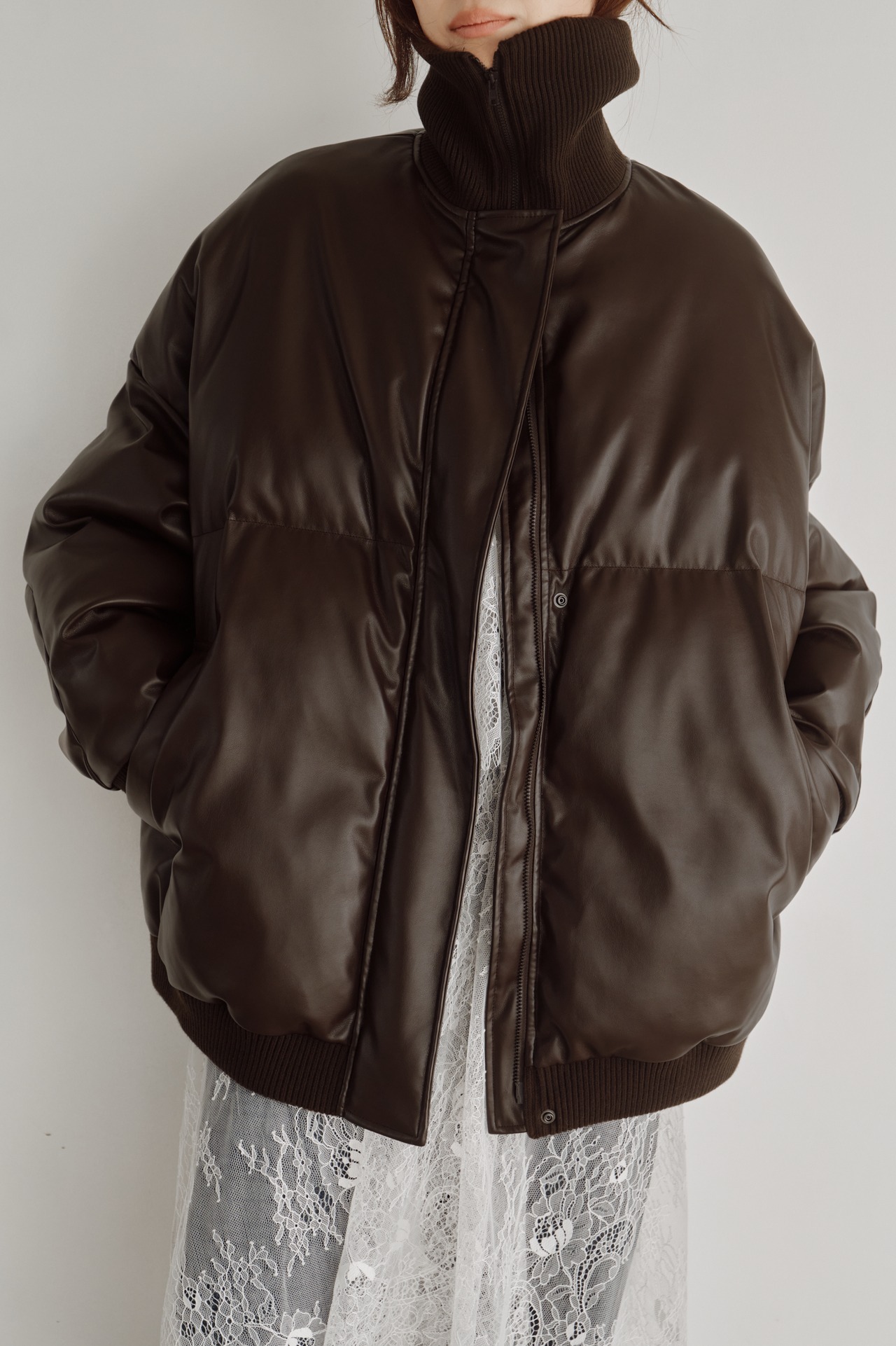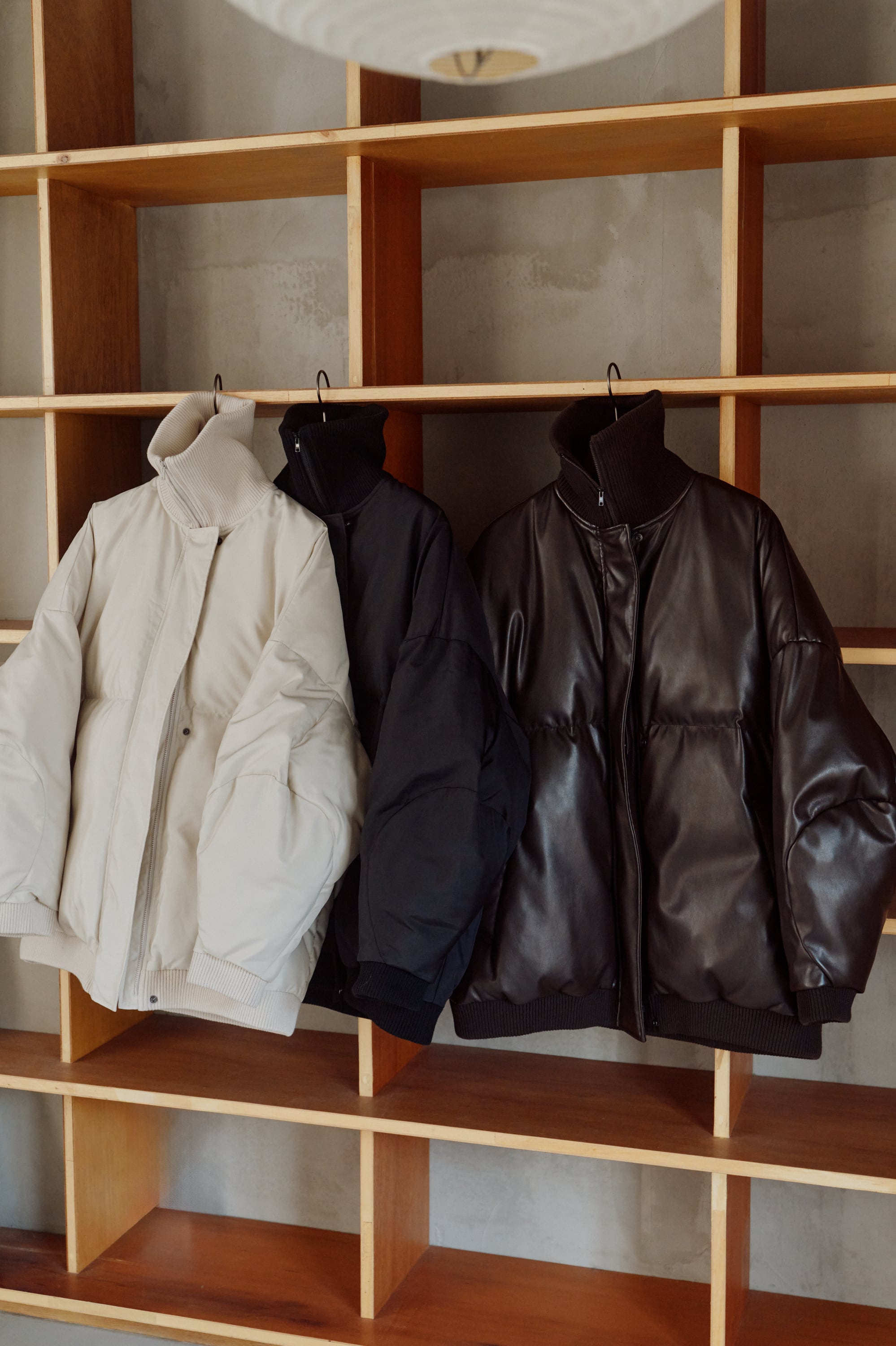 カジュアルになりがちなパッディットコートを、高めに設定した編み立てのハイネックでシックな印象に仕上げました。