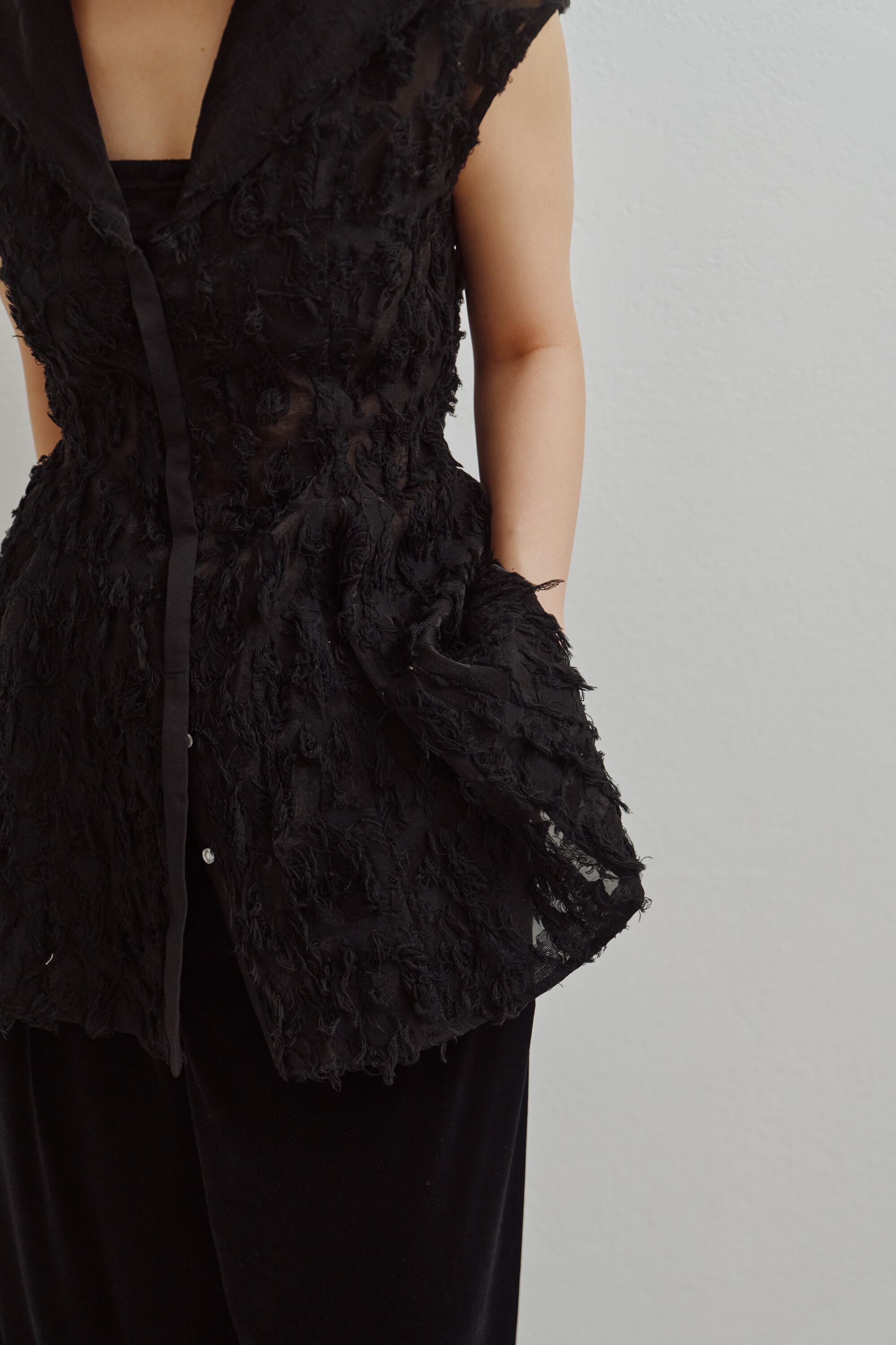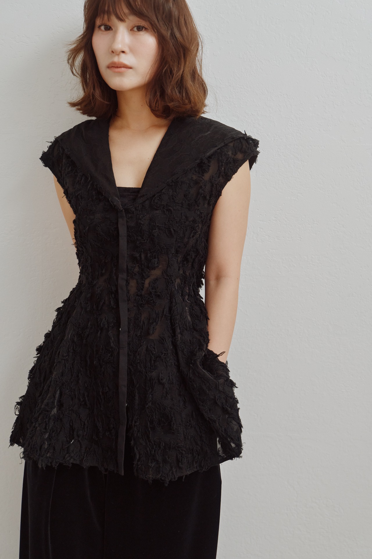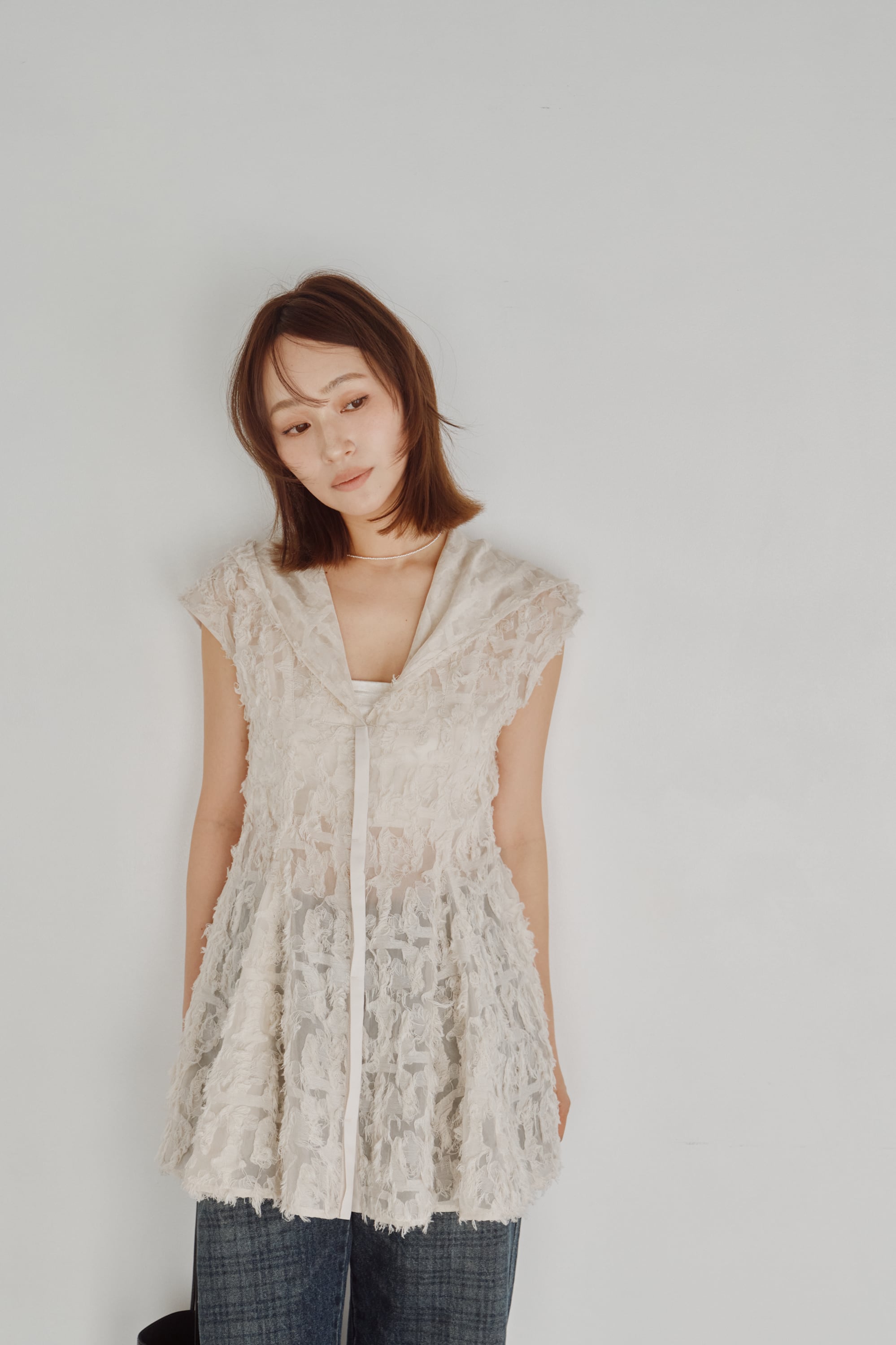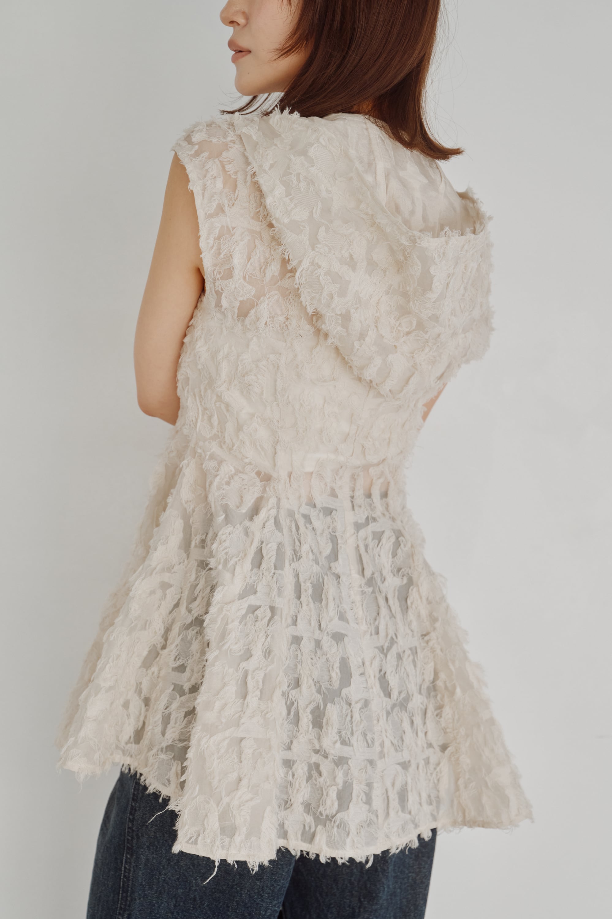 透け感のあるカットジャガード素材で仕立てたフーディートップス。