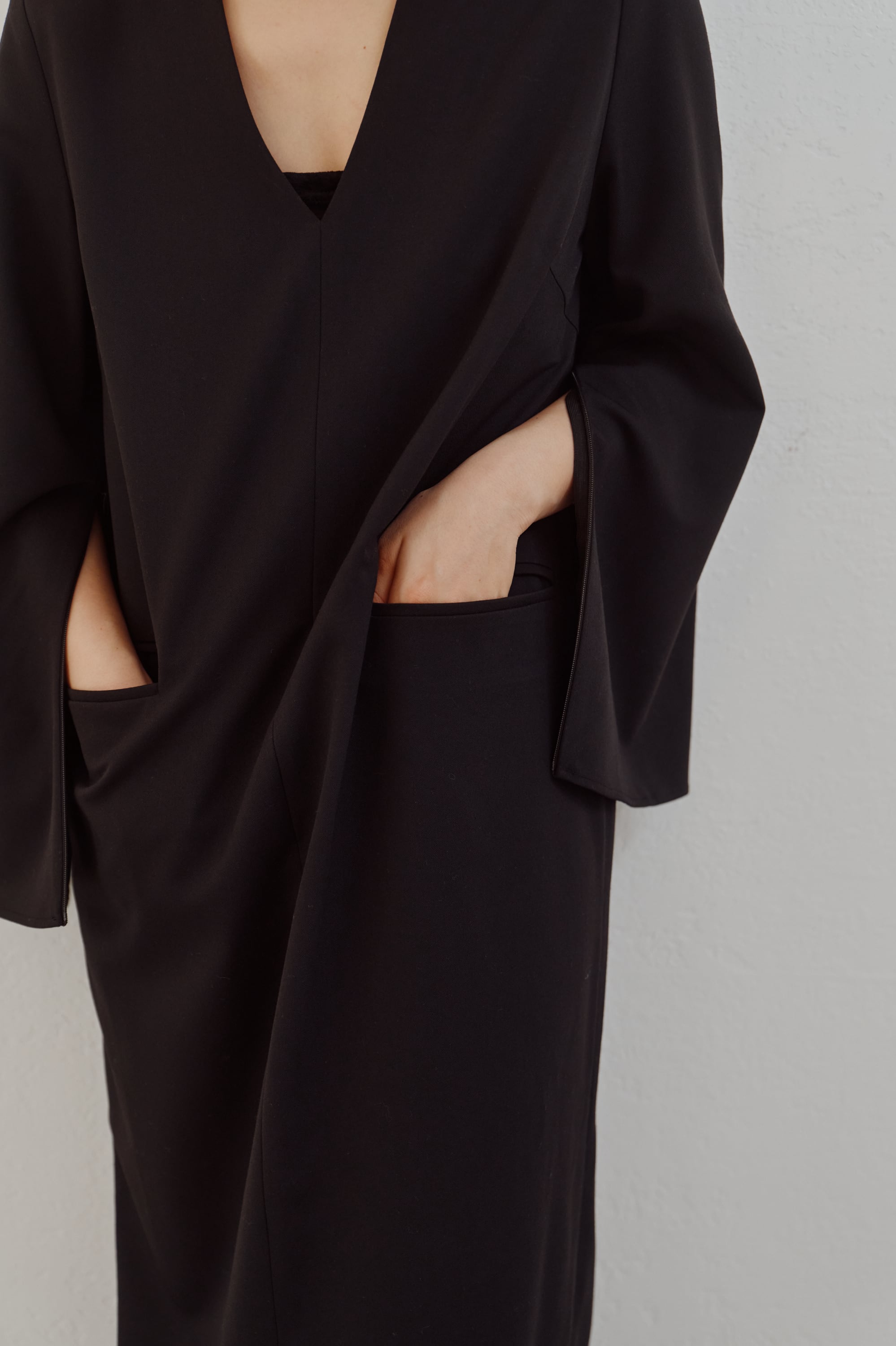 袖にはコンシールファスナーを施し、開けるとスリットのように広がるデザイン。