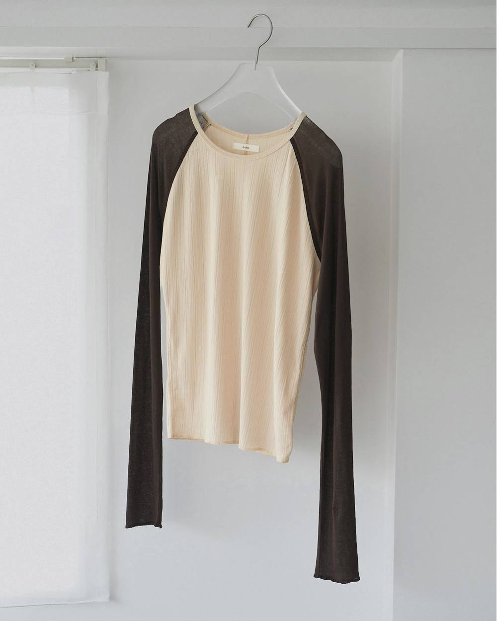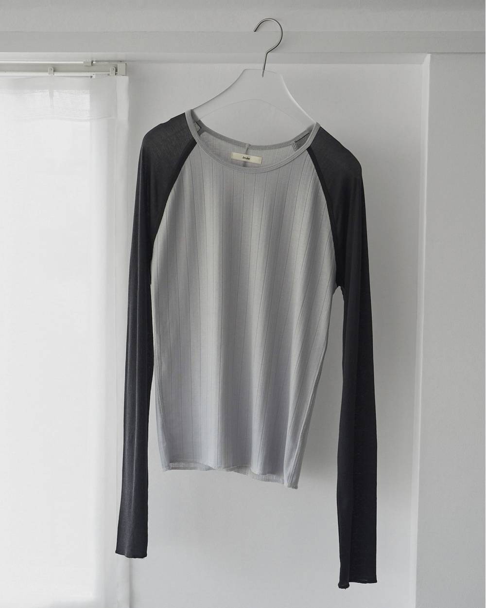 ほんのりと透ける素材と、ニュアンスカラーの配色が魅力のラグラントップス。身頃には変形リブ、袖にはややシャリ感のある生地を使用。異なる表情のコントラストが、一枚でも奥行きを生みます。程よく体に馴染む、コンパクトすぎないすっきりとしたシルエット。ラフなドロストパンツやタックパンツなど、ワイドボトムとのバランスも取りやすい一枚です。