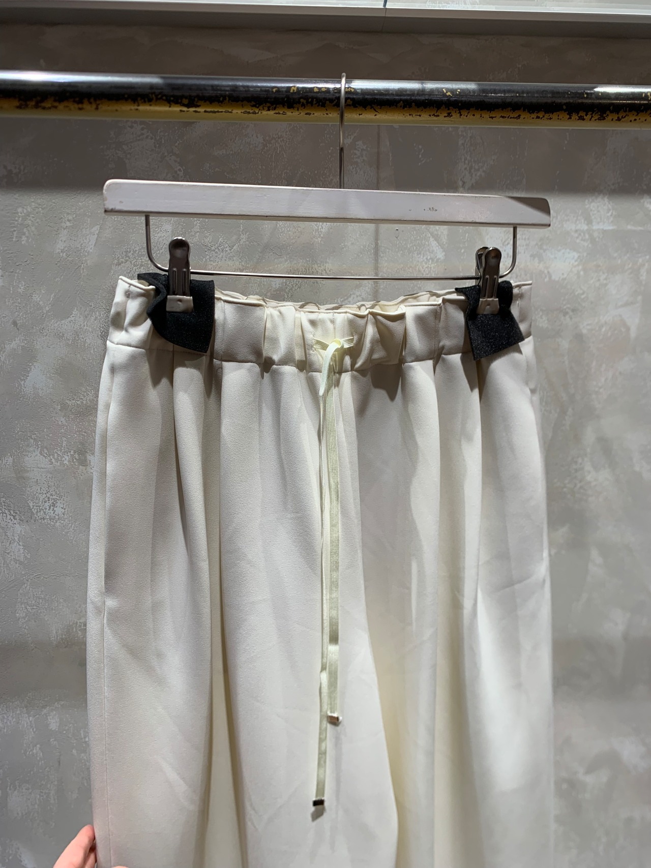 ウエストは総ゴム仕様で調整ひも付き、腰回りにゆとりのある履きやすいパンツです。